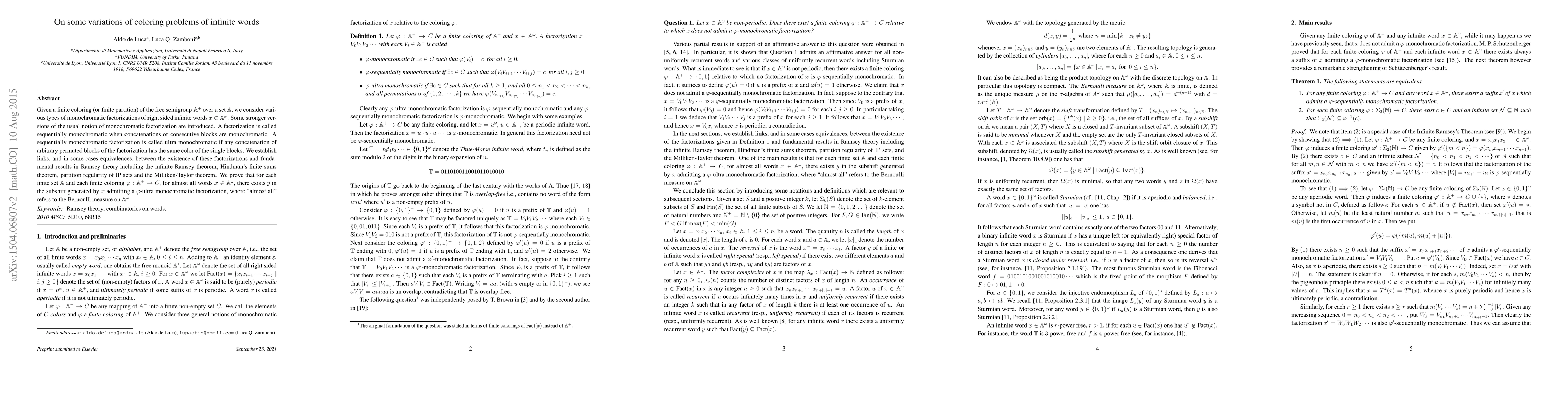 Given a finite coloring (or finite partition) of the free semigroup $A^+$ over a set $A$, we consider various types of monochromatic factorizations of right sided infinite words $x\in A^\omega$. Some stronger versions of the usual notion of monochromatic factorization are introduced. A factorization is called sequentially monochromatic when concatenations of consecutive blocks are monochromatic. A sequentially monochromatic factorization is called ultra monochromatic if any concatenation of arbitrary permuted blocks of the factorization has the same color of the single blocks. We establish links, and in some cases equivalences, between the existence of these factorizations and fundamental results in Ramsey theory including the infinite Ramsey theorem, Hindman's finite sums theorem, partition regularity of IP sets and the Milliken-Taylor theorem. We prove that for each finite set $A$ and each finite coloring $\varphi: A^+\rightarrow C,$ for almost all words $x\in A^\omega,$ there exists $y$ in the subshift generated by $x$ admitting a $\varphi$-ultra monochromatic factorization, where "almost all" refers to the Bernoulli measure on $A^\omega.$