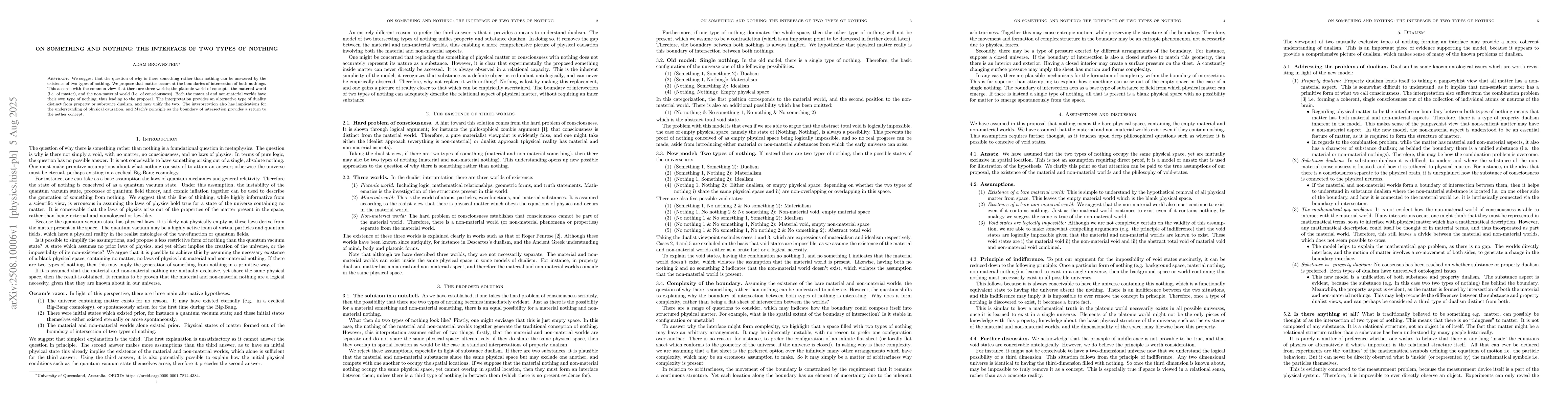 We suggest that the question of why is there something rather than nothing can be answered by the existence of two types of nothing. We propose that matter occurs at the boundaries of intersection of both nothings. This accords with the common view that there are three worlds; the platonic world of concepts, the material world (i.e. of matter), and the non-material world (i.e. of consciousness). Both the material and non-material worlds have their own type of nothing, thus leading to the proposal. The interpretation provides an alternative type of duality distinct from property or substance dualism, and may unify the two. The interpretation also has implications for the understanding of physical causation, and Mach's principle as the boundary of intersection provides a return to the aether concept.