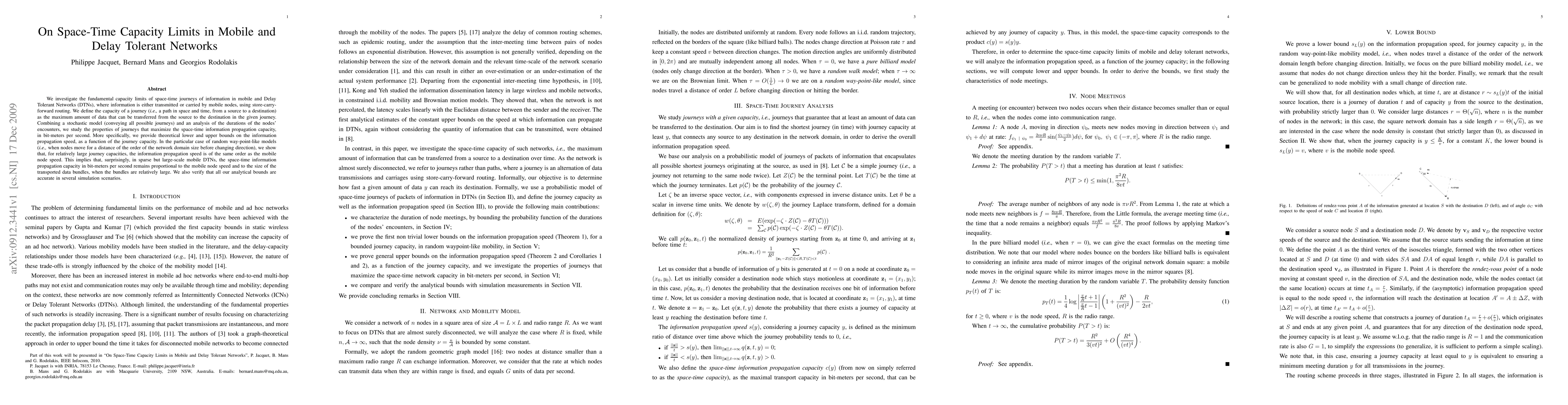 This paper investigates the fundamental capacity limits of information transfer in mobile and Delay Tolerant Networks (DTNs) using store-carry-forward routing. It provides theoretical bounds on the space-time information propagation speed, showing that, for large data bundles, the capacity remains proportional to mobile node speed and bundle size in sparse but large-scale networks.