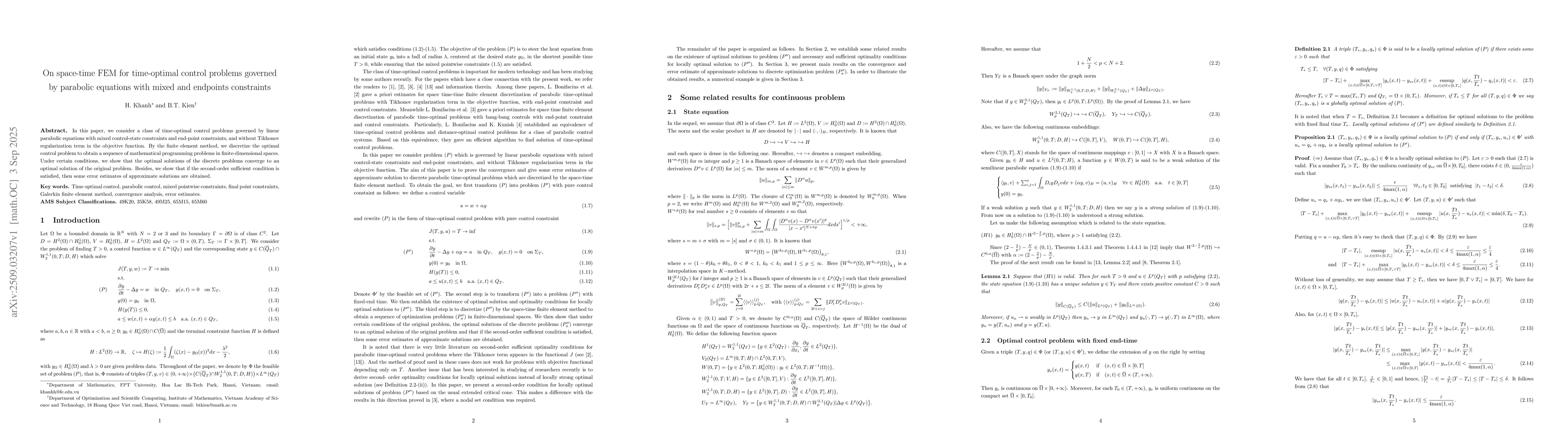 In this paper, we consider a class of time-optimal control problems governed by linear parabolic equations with mixed control-state constraints and end-point constraints, and without Tikhonov regularization term in the objective function. By the finite element method, we discretize the optimal control problem to obtain a sequence of mathematical programming problems in finite-dimensional spaces. Under certain conditions, we show that the optimal solutions of the discrete problems converge to an optimal solution of the original problem. Besides, we show that if the second-order sufficient condition is satisfied, then some error estimates of approximate solutions are obtained.