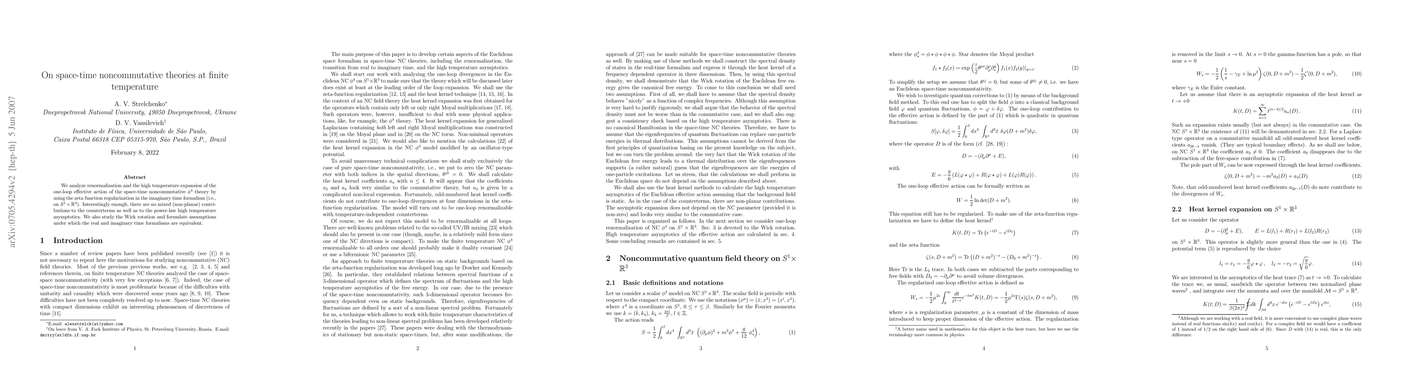 This paper examines the renormalization and high-temperature expansion of the one-loop effective action for noncommutative space-time \phi^4 theory using zeta function regularization. It finds no mixed contributions to counterterms or high-temperature asymptotics, and explores Wick rotation equivalence between real and imaginary time formalisms.