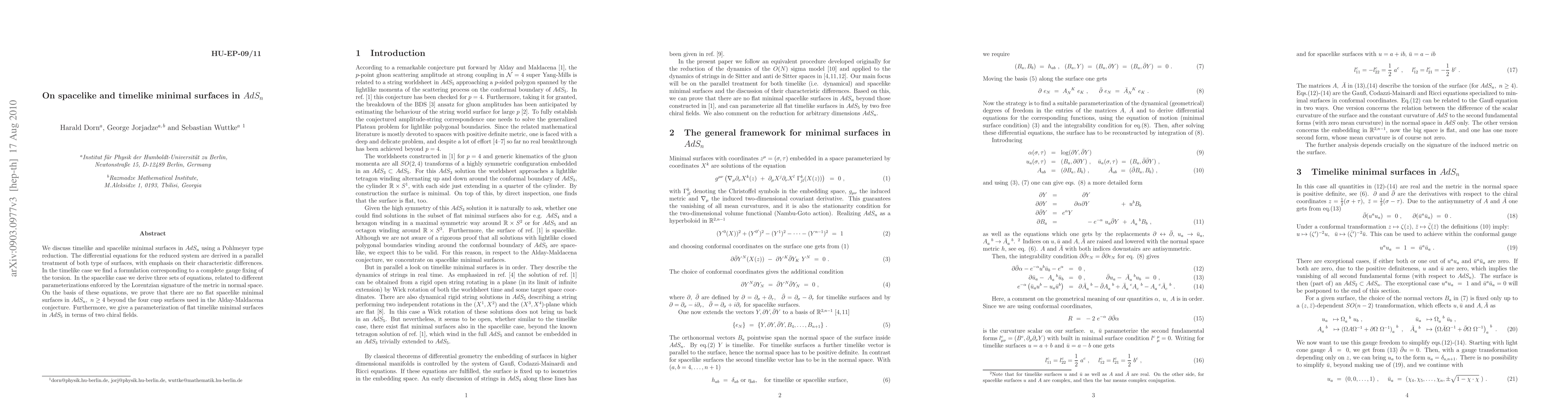This paper explores timelike and spacelike minimal surfaces in $AdS_n$ via a Pohlmeyer reduction, deriving differential equations for both types and highlighting their differences. It proves that no flat spacelike minimal surfaces exist in $AdS_n$ for $n \geq 4$ beyond four cusp surfaces, and provides a parameterization for flat timelike minimal surfaces in $AdS_5$ using two chiral fields.