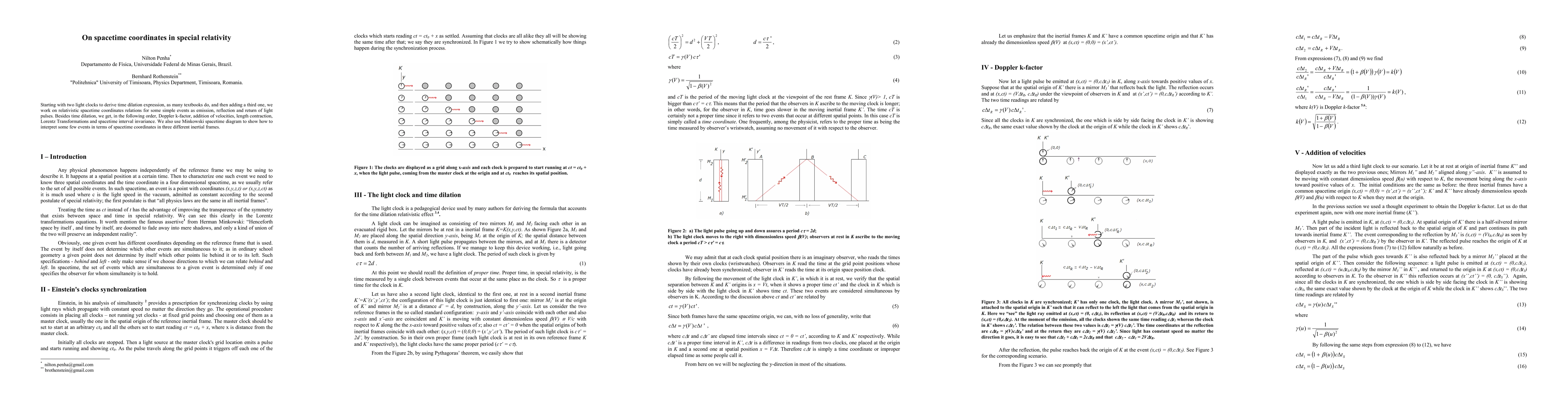 Starting with two light clocks to derive time dilation expression, as many textbooks do, and then adding a third one, we work on relativistic spacetime coordinates relations for some simple events as emission, reflection and return of light pulses. Besides time dilation, we get, in the following order, Doppler k-factor, addition of velocities, length contraction, Lorentz Transformations and spacetime interval invariance. We also use Minkowski spacetime diagram to show how to interpret some few events in terms of spacetime coordinates in three different inertial frames.