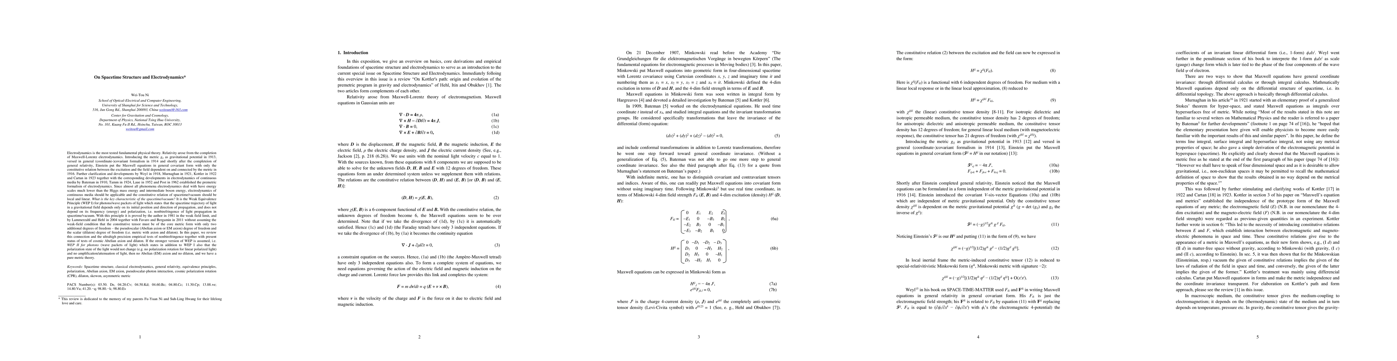 Since almost all phenomena electrodynamics deal with have energy scales much lower than the Higgs mass energy and intermediate boson energy, electrodynamics of continuous media should be applicable and the constitutive relation of spacetime/vacuum should be local and linear. What is the key characteristic of the spacetime/vacuum? It is the Weak Equivalence Principle (WEP I) for photons/wave packets of light which states that the spacetime trajectory of light in a gravitational field depends only on its initial position and direction of propagation, and does not depend on its frequency (energy) and polarization, i.e. nonbirefringence of light propagation in spacetime/vacuum. With this principle it is proved by the author in 1981 in the weak field limit, and by Lammerzahl and Hehl in 2004 together with Favaro and Bergamin in 2011 without assuming the weak-field condition that the constitutive tensor must be of the core metric form with only two additional degrees of freedom - the pseudoscalar (Abelian axion or EM axion) degree of freedom and the scalar (dilaton) degree of freedom (i.e. metric with axion and dilaton). In this paper, we review this connection and the ultrahigh precision empirical tests of nonbirefringence together with present status of tests of cosmic Abelian axion and dilaton. If the stronger version of WEP is assumed, i.e. WEP II for photons (wave packets of light) which states in addition to WEP I also that the polarization state of the light would not change (e.g. no polarization rotation for linear polarized light) and no amplification/attenuation of light, then no Abelian (EM) axion and no dilaton, and we have a pure metric theory.