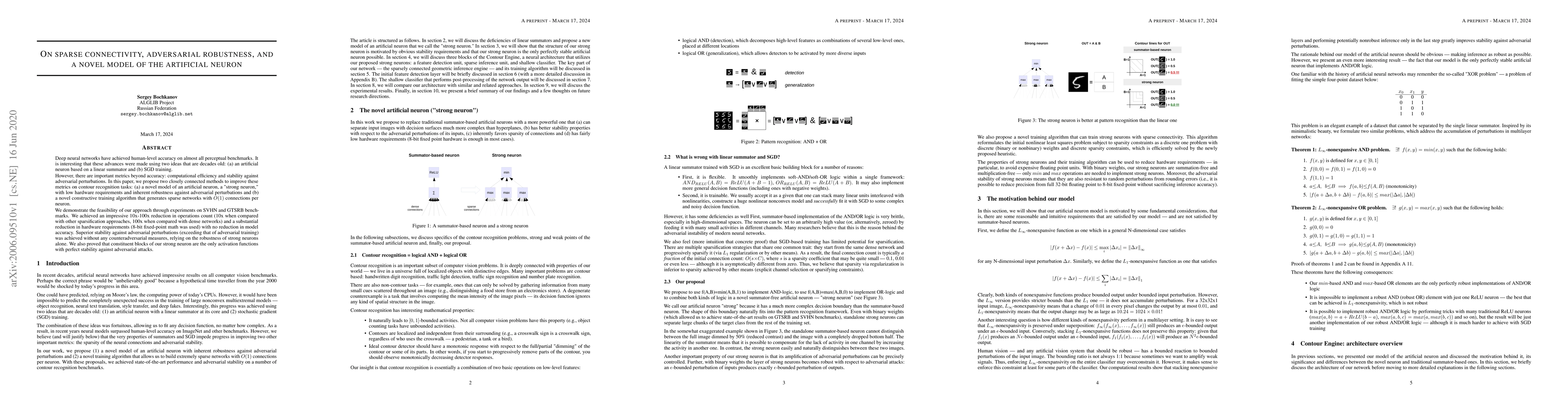 Deep neural networks have achieved human-level accuracy on almost all perceptual benchmarks. It is interesting that these advances were made using two ideas that are decades old: (a) an artificial neuron based on a linear summator and (b) SGD training. However, there are important metrics beyond accuracy: computational efficiency and stability against adversarial perturbations. In this paper, we propose two closely connected methods to improve these metrics on contour recognition tasks: (a) a novel model of an artificial neuron, a "strong neuron," with low hardware requirements and inherent robustness against adversarial perturbations and (b) a novel constructive training algorithm that generates sparse networks with $O(1)$ connections per neuron. We demonstrate the feasibility of our approach through experiments on SVHN and GTSRB benchmarks. We achieved an impressive 10x-100x reduction in operations count (10x when compared with other sparsification approaches, 100x when compared with dense networks) and a substantial reduction in hardware requirements (8-bit fixed-point math was used) with no reduction in model accuracy. Superior stability against adversarial perturbations (exceeding that of adversarial training) was achieved without any counteradversarial measures, relying on the robustness of strong neurons alone. We also proved that constituent blocks of our strong neuron are the only activation functions with perfect stability against adversarial attacks.