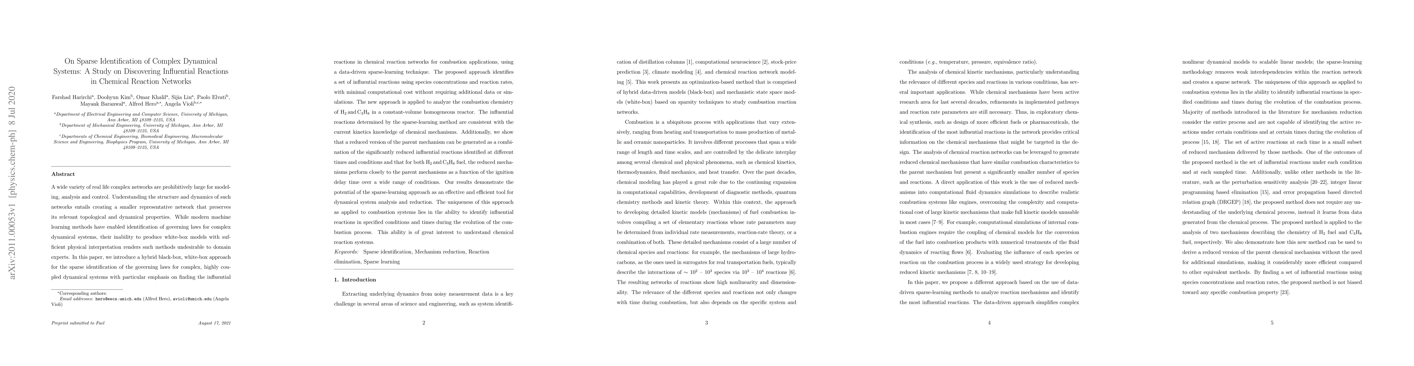 A wide variety of real life complex networks are prohibitively large for modeling, analysis and control. Understanding the structure and dynamics of such networks entails creating a smaller representative network that preserves its relevant topological and dynamical properties. While modern machine learning methods have enabled identification of governing laws for complex dynamical systems, their inability to produce white-box models with sufficient physical interpretation renders such methods undesirable to domain experts. In this paper, we introduce a hybrid black-box, white-box approach for the sparse identification of the governing laws for complex, highly coupled dynamical systems with particular emphasis on finding the influential reactions in chemical reaction networks for combustion applications, using a data-driven sparse-learning technique. The proposed approach identifies a set of influential reactions using species concentrations and reaction rates,with minimal computational cost without requiring additional data or simulations. The new approach is applied to analyze the combustion chemistry of H2 and C3H8 in a constant-volume homogeneous reactor. The influential reactions determined by the sparse-learning method are consistent with the current kinetics knowledge of chemical mechanisms. Additionally, we show that a reduced version of the parent mechanism can be generated as a combination of the significantly reduced influential reactions identified at different times and conditions and that for both H2 and C3H8 fuel, the reduced mechanisms perform closely to the parent mechanisms as a function of the ignition delay time over a wide range of conditions. Our results demonstrate the potential of the sparse-learning approach as an effective and efficient tool for dynamical system analysis and reduction. The uniqueness of this approach as applied to combustion systems lies in the ability to identify influential reactions in specified conditions and times during the evolution of the combustion process. This ability is of great interest to understand chemical reaction systems.