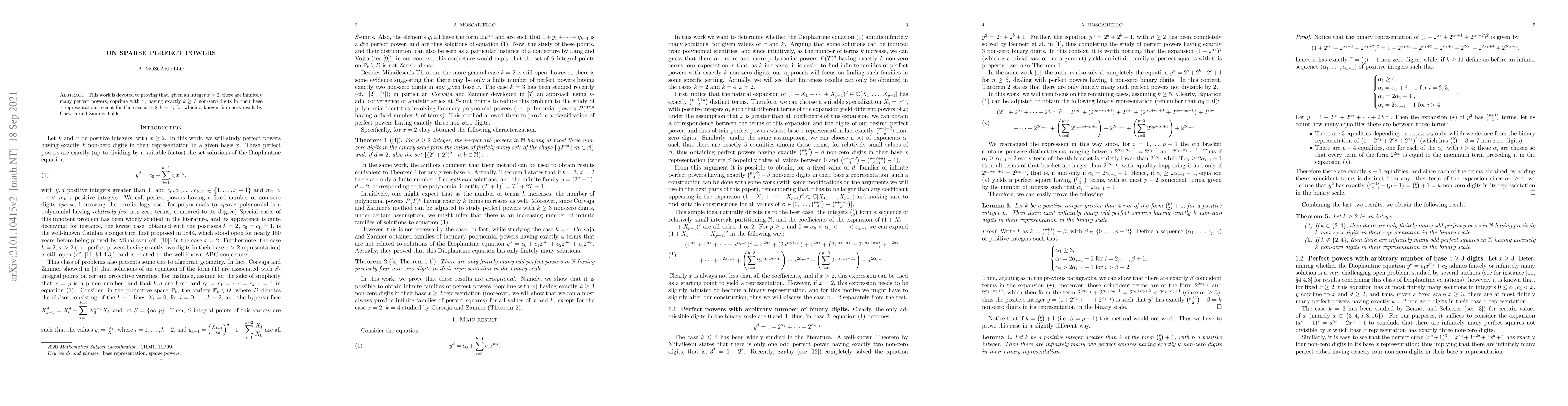 This work is devoted to proving that, given an integer $x \ge 2$, there are infinitely many perfect powers, coprime with $x$, having exactly $k \ge 3$ non-zero digits in their base $x$ representation, except for the case $x=2, k=4$, for which a known finiteness result by Corvaja and Zannier holds.