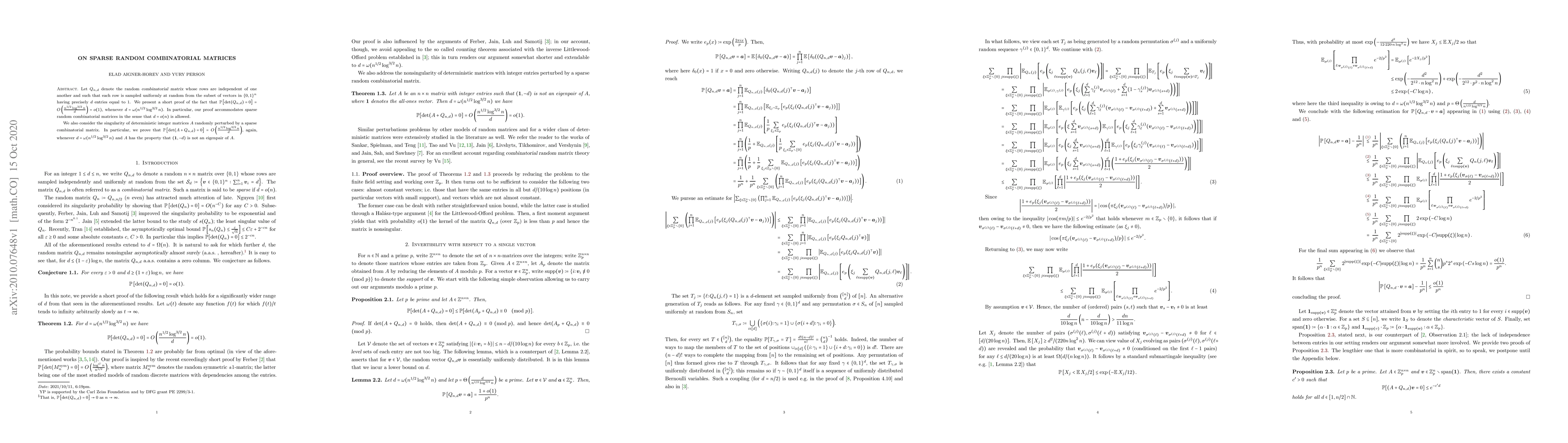 Let $Q_{n,d}$ denote the random combinatorial matrix whose rows are independent of one another and such that each row is sampled uniformly at random from the subset of vectors in $\{0,1\}^n$ having precisely $d$ entries equal to $1$. We present a short proof of the fact that $\Pr[\det(Q_{n,d})=0] = O\left(\frac{n^{1/2}\log^{3/2} n}{d}\right)=o(1)$, whenever $d=\omega(n^{1/2}\log^{3/2} n)$. In particular, our proof accommodates sparse random combinatorial matrices in the sense that $d = o(n)$ is allowed. We also consider the singularity of deterministic integer matrices $A$ randomly perturbed by a sparse combinatorial matrix. In particular, we prove that $\Pr[\det(A+Q_{n,d})=0]=O\left(\frac{n^{1/2}\log^{3/2} n}{d}\right)$, again, whenever $d=\omega(n^{1/2}\log^{3/2} n)$ and $A$ has the property that $(1,-d)$ is not an eigenpair of $A$.