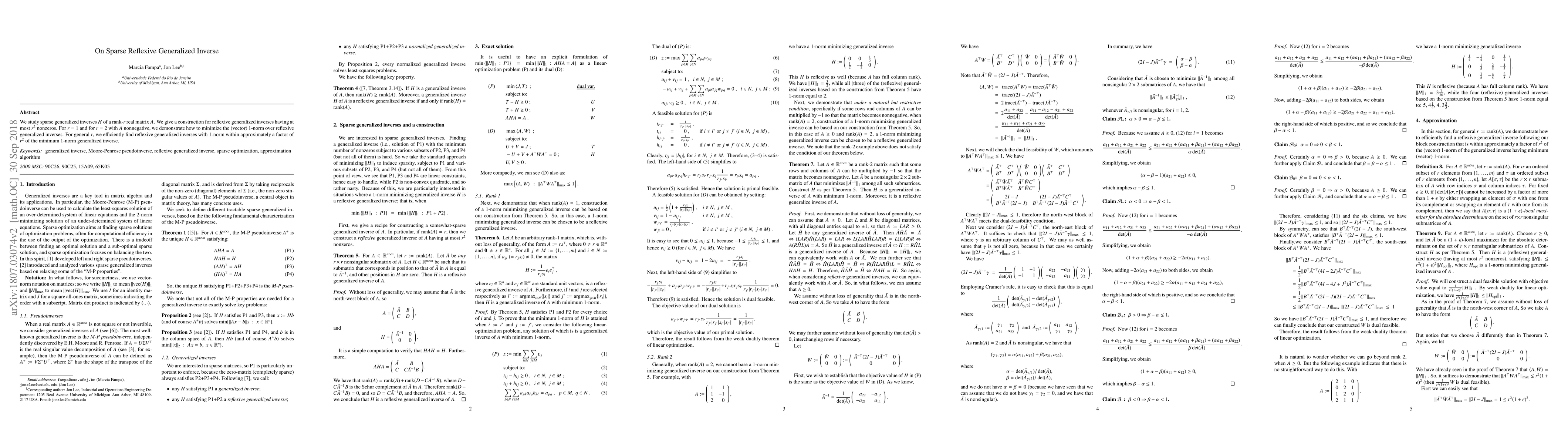 This paper constructs sparse reflexive generalized inverses of rank-$r$ matrices with at most $r^2$ nonzeros. It provides methods to minimize the vector 1-norm for $r=1$ and $r=2$ nonnegative matrices, and finds approximate solutions for general $r$.