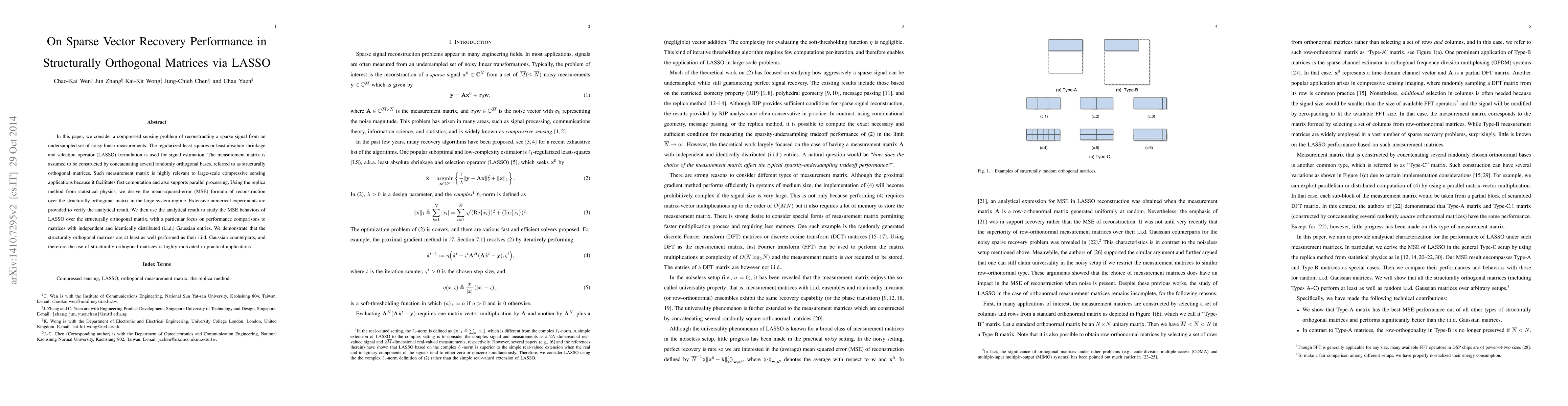 In this paper, we consider a compressed sensing problem of reconstructing a sparse signal from an undersampled set of noisy linear measurements. The regularized least squares or least absolute shrinkage and selection operator (LASSO) formulation is used for signal estimation. The measurement matrix is assumed to be constructed by concatenating several randomly orthogonal bases, referred to as structurally orthogonal matrices. Such measurement matrix is highly relevant to large-scale compressive sensing applications because it facilitates fast computation and also supports parallel processing. Using the replica method from statistical physics, we derive the mean-squared-error (MSE) formula of reconstruction over the structurally orthogonal matrix in the large-system regime. Extensive numerical experiments are provided to verify the analytical result. We then use the analytical result to study the MSE behaviors of LASSO over the structurally orthogonal matrix, with a particular focus on performance comparisons to matrices with independent and identically distributed (i.i.d.) Gaussian entries. We demonstrate that the structurally orthogonal matrices are at least as well performed as their i.i.d. Gaussian counterparts, and therefore the use of structurally orthogonal matrices is highly motivated in practical applications.