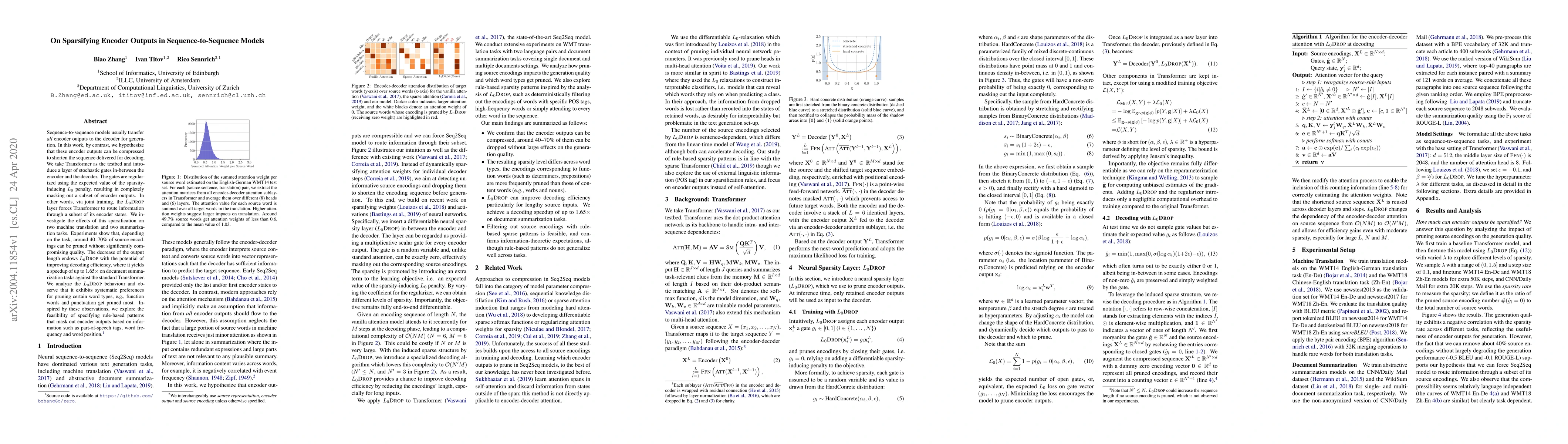 Sequence-to-sequence models usually transfer all encoder outputs to the decoder for generation. In this work, by contrast, we hypothesize that these encoder outputs can be compressed to shorten the sequence delivered for decoding. We take Transformer as the testbed and introduce a layer of stochastic gates in-between the encoder and the decoder. The gates are regularized using the expected value of the sparsity-inducing L0penalty, resulting in completely masking-out a subset of encoder outputs. In other words, via joint training, the L0DROP layer forces Transformer to route information through a subset of its encoder states. We investigate the effects of this sparsification on two machine translation and two summarization tasks. Experiments show that, depending on the task, around 40-70% of source encodings can be pruned without significantly compromising quality. The decrease of the output length endows L0DROP with the potential of improving decoding efficiency, where it yields a speedup of up to 1.65x on document summarization tasks against the standard Transformer. We analyze the L0DROP behaviour and observe that it exhibits systematic preferences for pruning certain word types, e.g., function words and punctuation get pruned most. Inspired by these observations, we explore the feasibility of specifying rule-based patterns that mask out encoder outputs based on information such as part-of-speech tags, word frequency and word position.
