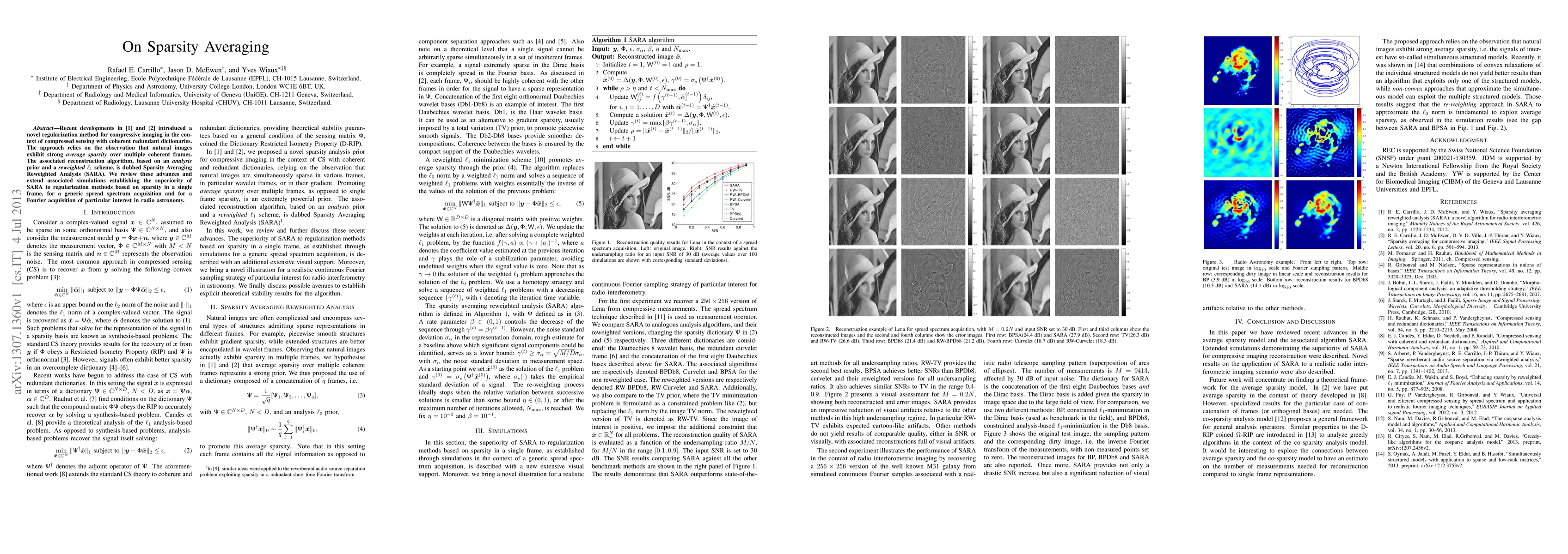 Recent developments in Carrillo et al. (2012) and Carrillo et al. (2013) introduced a novel regularization method for compressive imaging in the context of compressed sensing with coherent redundant dictionaries. The approach relies on the observation that natural images exhibit strong average sparsity over multiple coherent frames. The associated reconstruction algorithm, based on an analysis prior and a reweighted $\ell_1$ scheme, is dubbed Sparsity Averaging Reweighted Analysis (SARA). We review these advances and extend associated simulations establishing the superiority of SARA to regularization methods based on sparsity in a single frame, for a generic spread spectrum acquisition and for a Fourier acquisition of particular interest in radio astronomy.