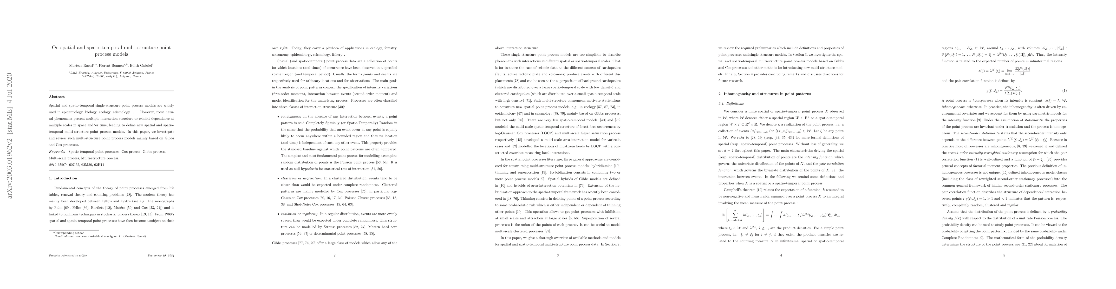 Spatial and spatio-temporal single-structure point process models are widely used in epidemiology, biology, ecology, seismology... . However, most natural phenomena present multiple interaction structure or exhibit dependence at multiple scales in space and/or time, leading to define new spatial and spatio-temporal multi-structure point process models. In this paper, we investigate and review such multi-structure point process models mainly based on Gibbs and Cox processes.