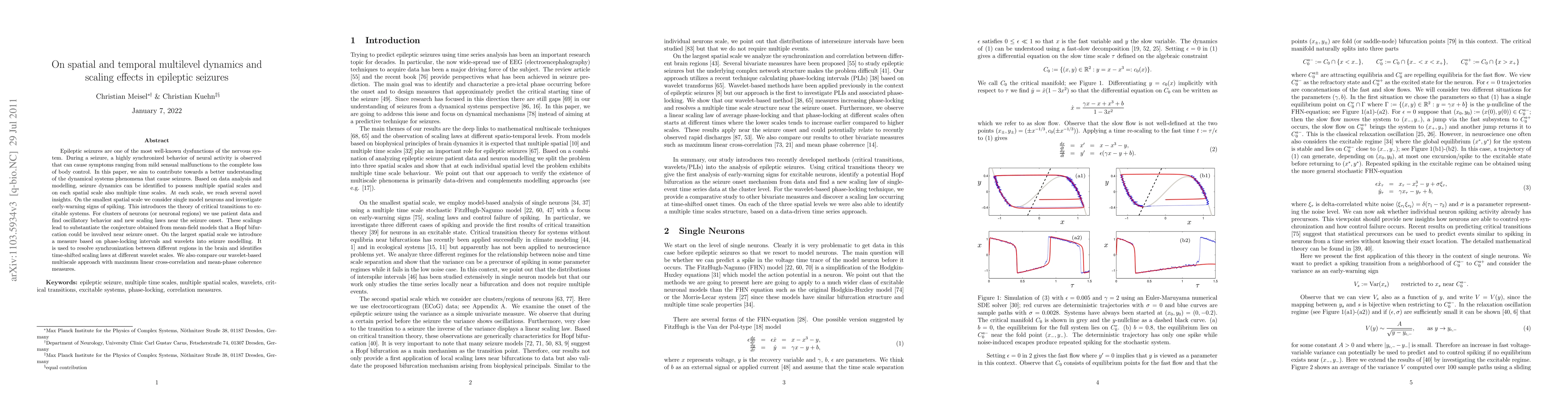 Epileptic seizures are one of the most well-known dysfunctions of the nervous system. During a seizure, a highly synchronized behavior of neural activity is observed that can cause symptoms ranging from mild sensual malfunctions to the complete loss of body control. In this paper, we aim to contribute towards a better understanding of the dynamical systems phenomena that cause seizures. Based on data analysis and modelling, seizure dynamics can be identified to possess multiple spatial scales and on each spatial scale also multiple time scales. At each scale, we reach several novel insights. On the smallest spatial scale we consider single model neurons and investigate early-warning signs of spiking. This introduces the theory of critical transitions to excitable systems. For clusters of neurons (or neuronal regions) we use patient data and find oscillatory behavior and new scaling laws near the seizure onset. These scalings lead to substantiate the conjecture obtained from mean-field models that a Hopf bifurcation could be involved near seizure onset. On the largest spatial scale we introduce a measure based on phase-locking intervals and wavelets into seizure modelling. It is used to resolve synchronization between different regions in the brain and identifies time-shifted scaling laws at different wavelet scales. We also compare our wavelet-based multiscale approach with maximum linear cross-correlation and mean-phase coherence measures.