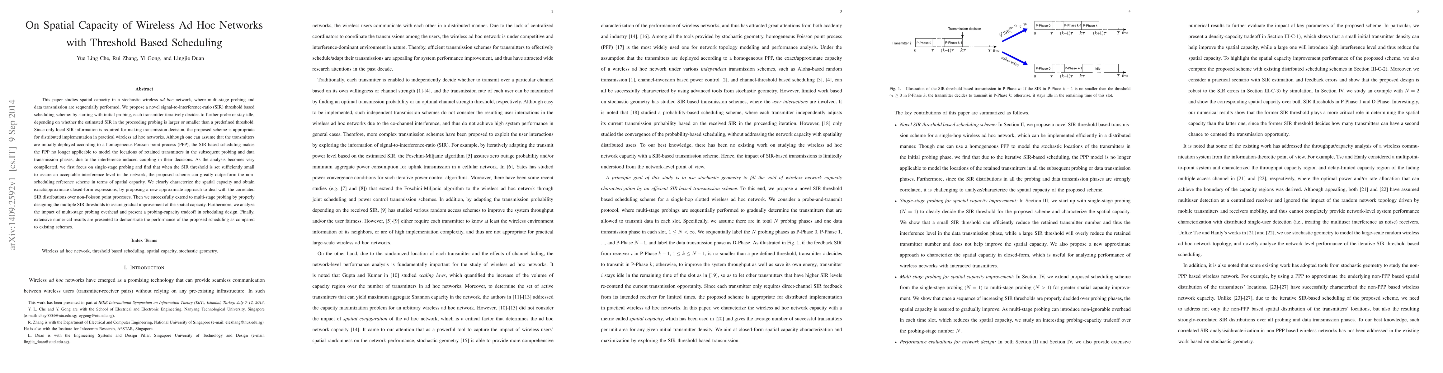 A new scheduling scheme improves spatial capacity in wireless ad hoc networks by iteratively probing for better signal-to-interference ratios, outperforming non-scheduling schemes with suitable threshold settings.