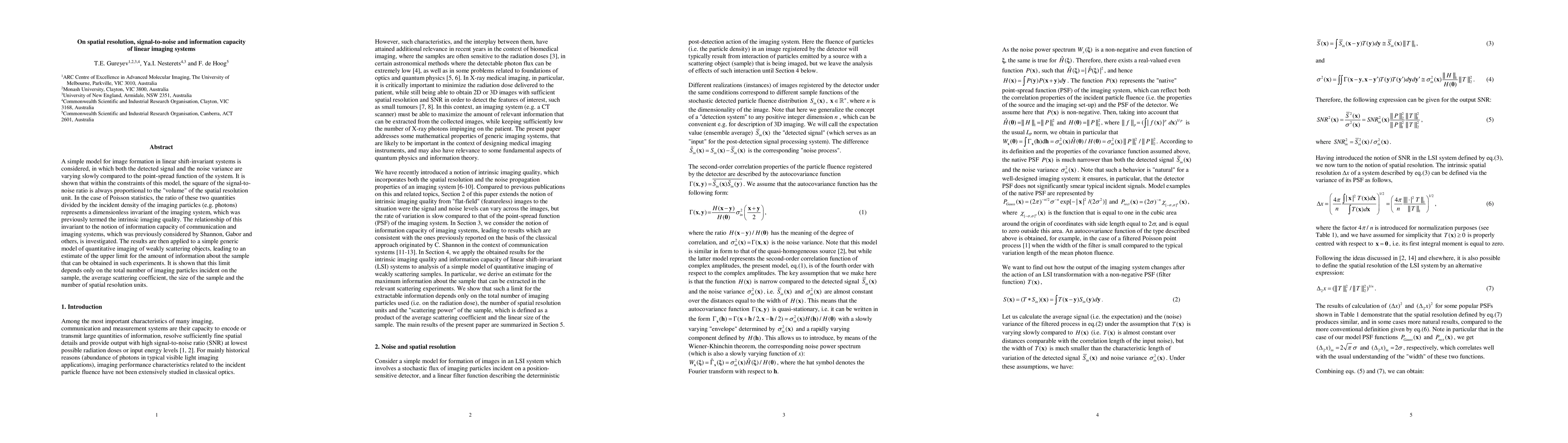 The paper presents a model for image formation in linear shift-invariant systems, analyzing the relationship between spatial resolution, signal-to-noise ratio, and information capacity. It derives expressions for the information capacity under Poisson and Gaussian noise conditions, considering a generic model of quantitative imaging of weakly scattering objects.