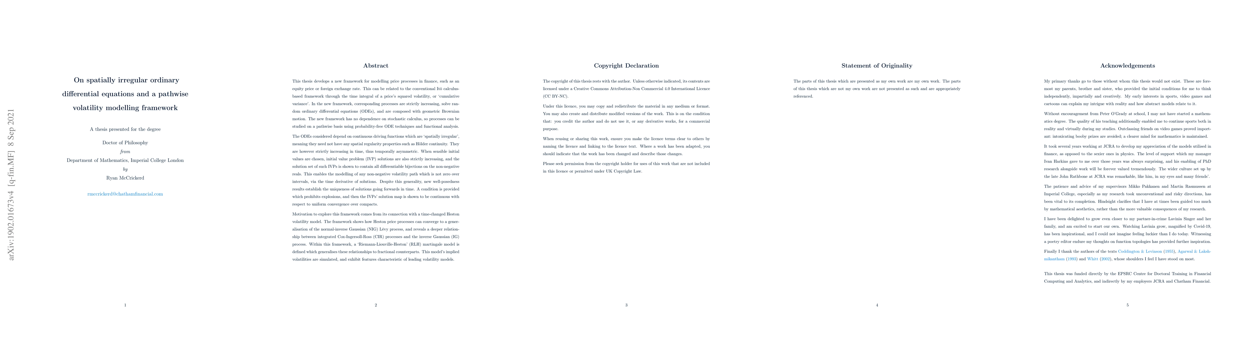 This thesis develops a new framework for modelling price processes in finance, such as an equity price or foreign exchange rate. This can be related to the conventional Ito calculus-based framework through the time integral of a price's squared volatility, or `cumulative variance'. In the new framework, corresponding processes are strictly increasing, solve random ordinary differential equations (ODEs), and are composed with geometric Brownian motion. The new framework has no dependence on stochastic calculus, so processes can be studied on a pathwise basis using probability-free ODE techniques and functional analysis. The ODEs considered depend on continuous driving functions which are `spatially irregular', meaning they need not have any spatial regularity properties such as Holder continuity. They are however strictly increasing in time, thus temporally asymmetric. When sensible initial values are chosen, initial value problem (IVP) solutions are also strictly increasing, and the solution set of such IVPs is shown to contain all differentiable bijections on the non-negative reals. This enables the modelling of any non-negative volatility path which is not zero over intervals, via the time derivative of solutions. Despite this generality, new well-posedness results establish the uniqueness of solutions going forwards in time. Motivation to explore this framework comes from its connection with a time-changed Heston volatility model. The framework shows how Heston price processes can converge to a generalisation of the NIG Levy process, and reveals a deeper relationship between integrated CIR processes and the IG process. Within this framework, a `Riemann-Liouville-Heston' martingale model is defined which generalises these relationships to fractional counterparts. This model's implied volatilities are simulated, and exhibit features characteristic of leading volatility models.