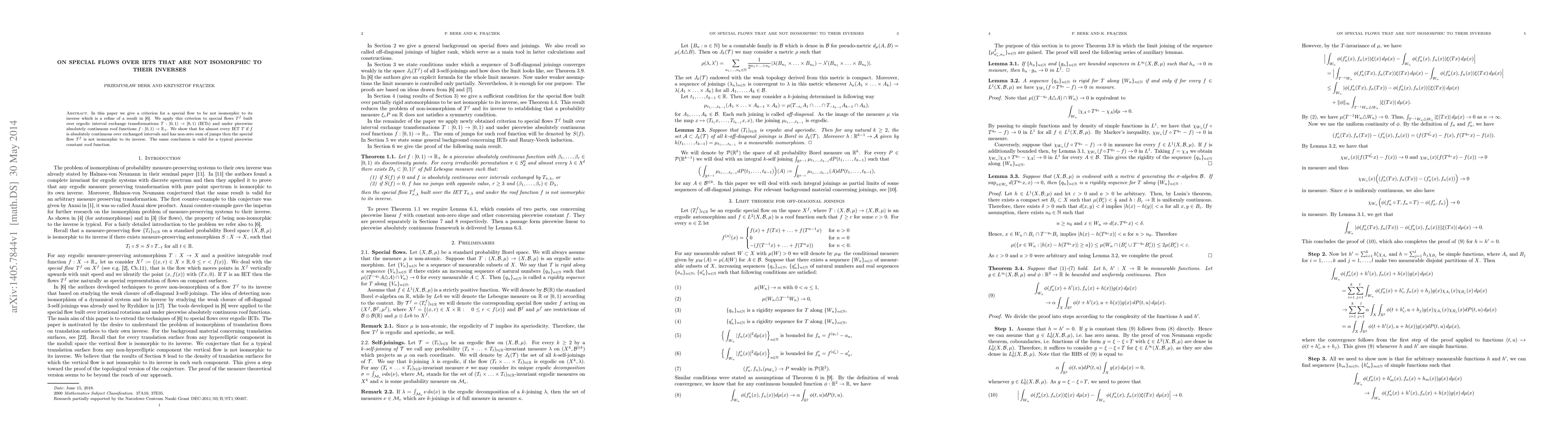 In this paper we give a criterion for a special flow to be not isomorphic to its inverse which is a refine of a result in \cite{Fr-Ku-Le}. We apply this criterion to special flows $T^f$ built over ergodic interval exchange transformations $T:[0,1)\to[0,1)$ (IETs) and under piecewise absolutely continuous roof functions $f:[0,1)\to\mathbb{R}_+$. We show that for almost every IET $T$ if $f$ is absolutely continuous over exchanged intervals and has non-zero sum of jumps then the special flow $T^f$ is not isomorphic to its inverse. The same conclusion is valid for a typical piecewise constant roof function.