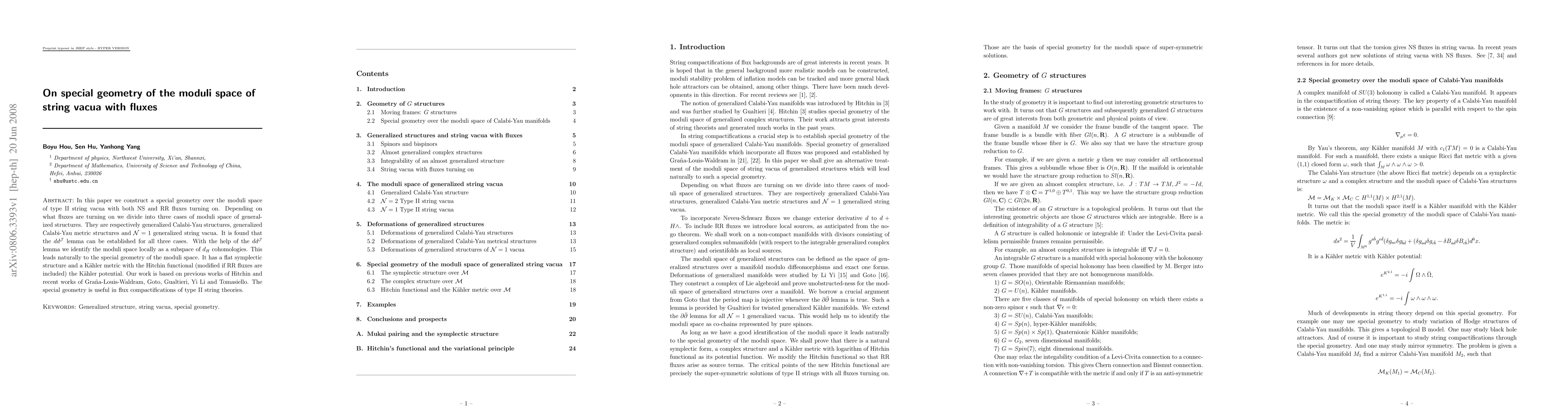 This paper constructs special geometry over the moduli space of type II string vacua with NS and RR fluxes, identifying it as a subspace of $d_{H}$ cohomologies and establishing a flat symplectic structure and Kähler metric with the Hitchin functional as the Kähler potential. The work builds on previous contributions from Hitchin and other researchers.
