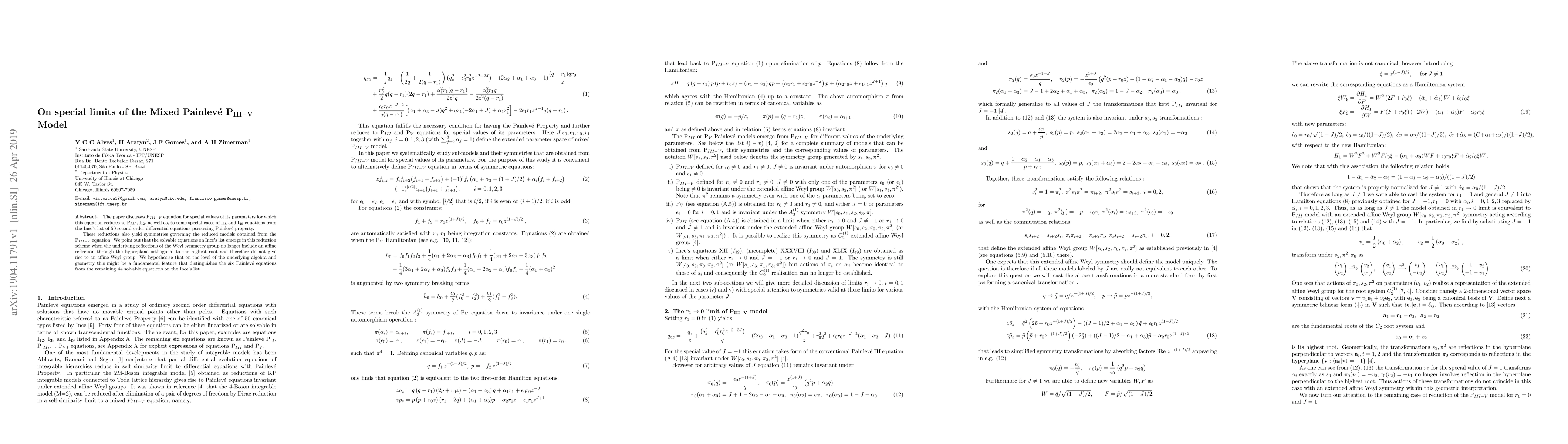 Researchers discovered special limits of the Mixed Painlevé P$_{III-V}$ model that reduce to well-known equations from Ince's list, highlighting a unique symmetry feature that distinguishes these six Painlevé equations from others.