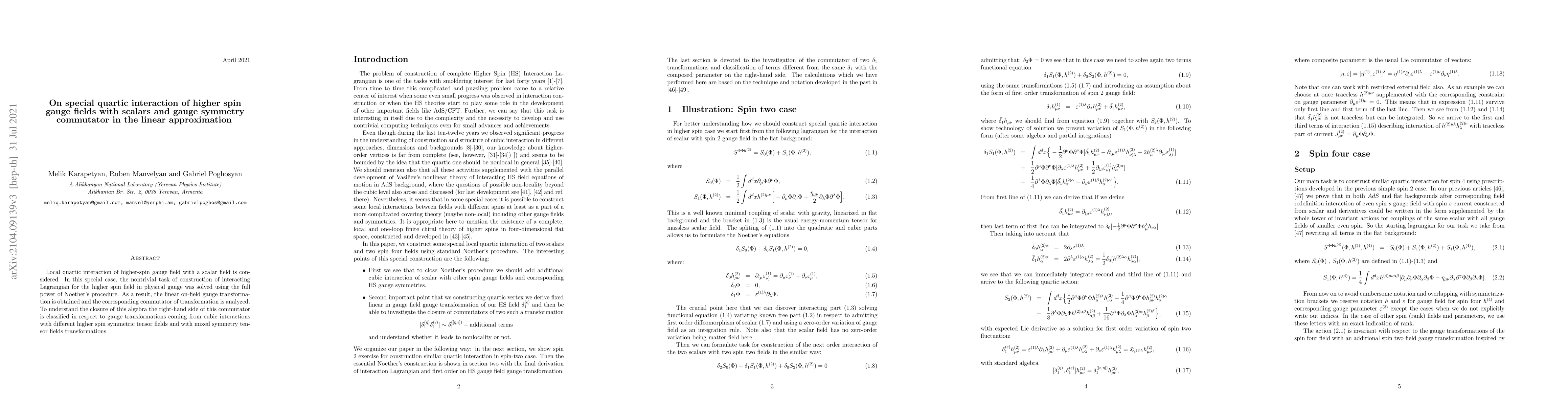 Local quartic interaction of higher-spin gauge field with a scalar field is considered. In this special case, the nontrivial task of construction of interacting Lagrangian for the higher spin field in physical gauge was solved using the full power of Noether's procedure. As a result, the linear on-field gauge transformation is obtained and the corresponding commutator of transformation is analyzed. To understand the closure of this algebra the right-hand side of this commutator is classified in respect to gauge transformations coming from cubic interactions with different higher spin symmetric tensor fields and with mixed symmetry tensor fields transformations.
