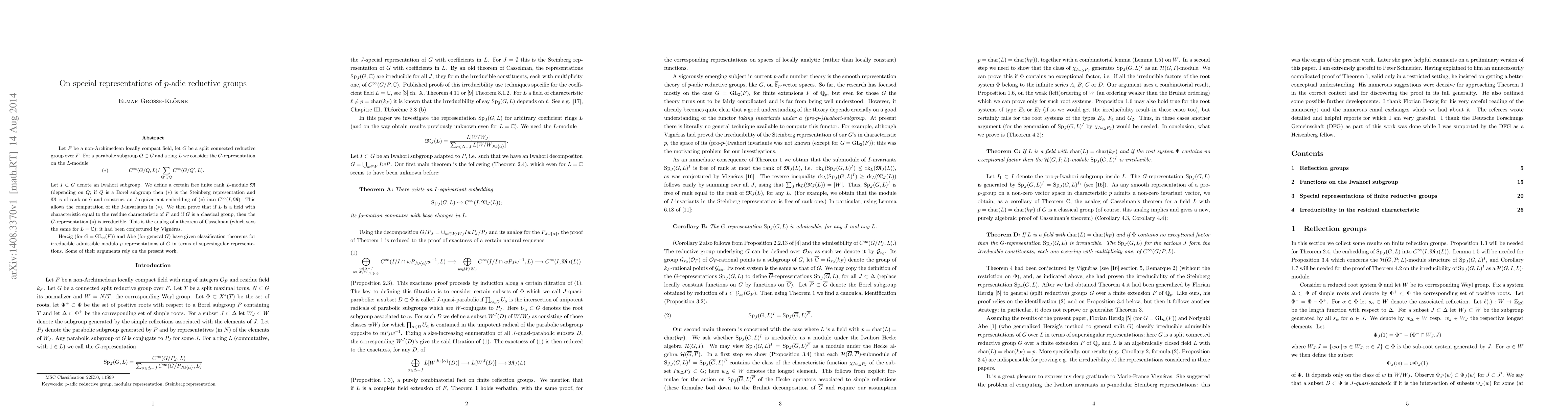 Let $F$ be a non-Archimedean locally compact field, let $G$ be a split connected reductive group over $F$. For a parabolic subgroup $Q\subset G$ and a ring $L$ we consider the $G$-representation on the $L$-module$$(*)\quad\quad\quad\quad C^{\infty}(G/Q,L)/\sum_{Q'\supsetneq Q}C^{\infty}(G/Q',L).$$Let $I\subset G$ denote an Iwahori subgroup. We define a certain free finite rank $L$-module ${\mathfrak M}$ (depending on $Q$; if $Q$ is a Borel subgroup then $(*)$ is the Steinberg representation and ${\mathfrak M}$ is of rank one) and construct an $I$-equivariant embedding of $(*)$ into $C^{\infty}(I,{\mathfrak M})$. This allows the computation of the $I$-invariants in $(*)$. We then prove that if $L$ is a field with characteristic equal to the residue characteristic of $F$ and if $G$ is a classical group, then the $G$-representation $(*)$ is irreducible. This is the analog of a theorem of Casselman (which says the same for $L={\mathbb C}$); it had been conjectured by Vign\'eras. Herzig (for $G={\rm GL}_n(F)$) and Abe (for general $G$) have given classification theorems for irreducible admissible modulo $p$ representations of $G$ in terms of supersingular representations. Some of their arguments rely on the present work.