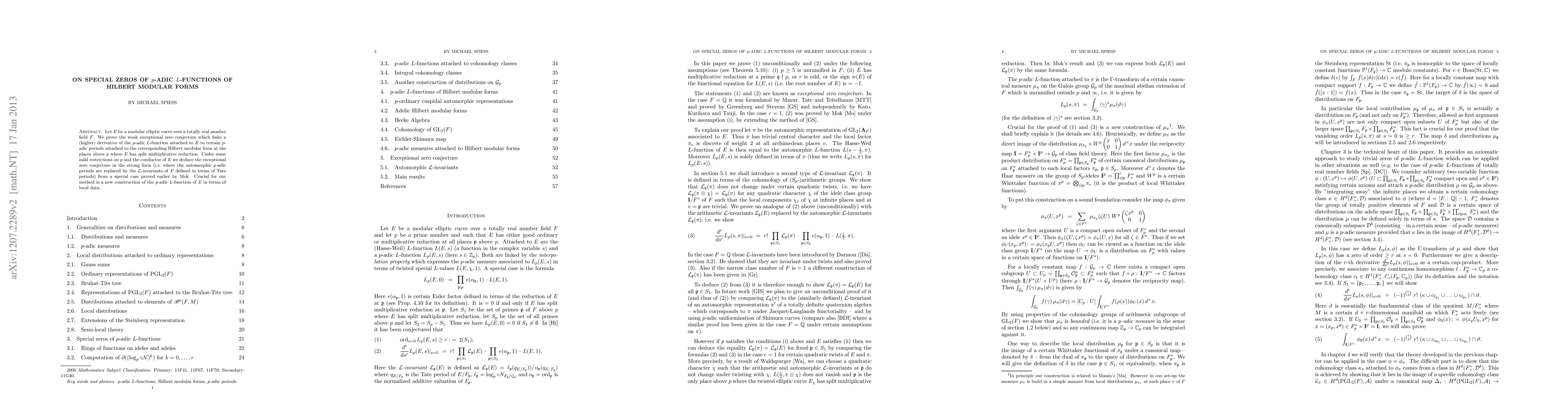 Let $E$ be a modular elliptic curve over a totally real number field $F$. We prove the weak exceptional zero conjecture which links a (higher) derivative of the $p$-adic $L$-function attached to $E$ to certain $p$-adic periods attached to the corresponding Hilbert modular form at the places above $p$ where $E$ has split multiplicative reduction. Under some mild restrictions on $p$ and the conductor of $E$ we deduce the exceptional zero conjecture in the strong form (i.e.\ where the automorphic $p$-adic periods are replaced by the $\cL$-invariants of $E$ defined in terms of Tate periods) from a special case proved earlier by Mok. Crucial for our method is a new construction of the $p$-adic $L$-function of $E$ in terms of local data.
