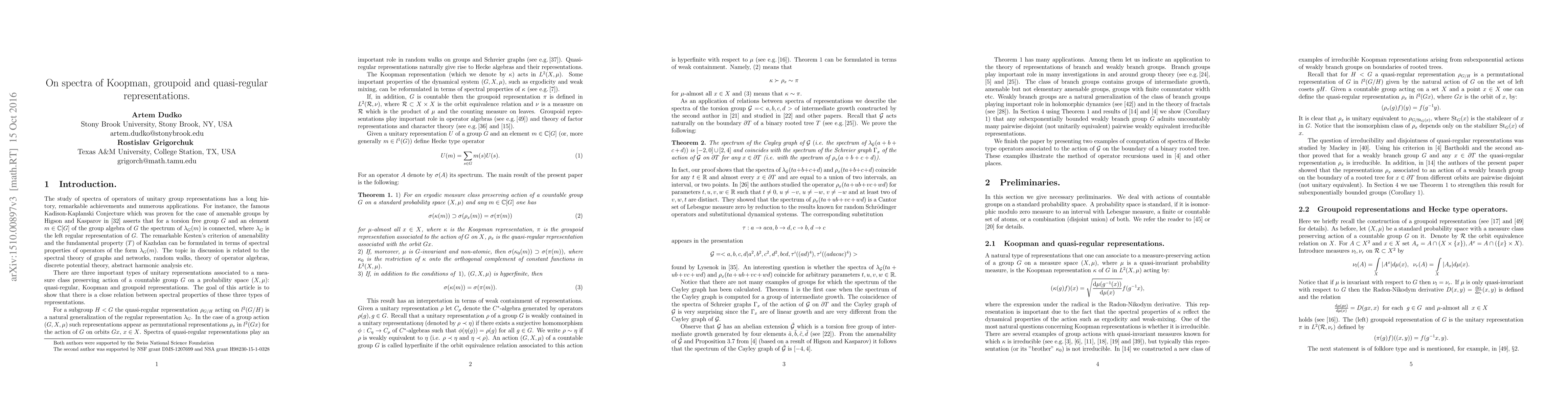 In this paper we investigate relations between Koopman, groupoid and quasi-regular representations of countable groups. We show that for an ergodic measure class preserving action of a countable group G on a standard Borel space the associated groupoid and quasi-regular representations are weakly equivalent and weakly contained in the Koopman representation. Moreover, if the action is hyperfinite then the Koopman representation is weakly equivalent to the groupoid. As a corollary of our results we obtain a continuum of pairwise disjoint pairwise equivalent irreducible representations of weakly branch groups. As an illustration we calculate spectra of regular, Koopman and groupoid representations associated to the action of the 2-group of intermediate growth constructed by the second author in 1980.