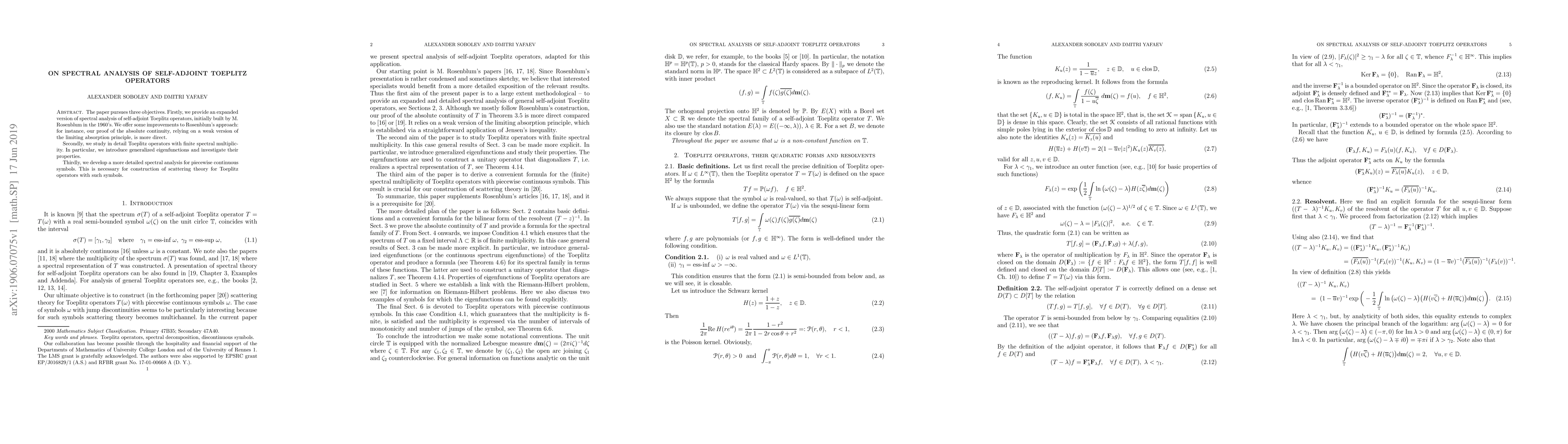 The research expands on M. Rosenblum's spectral analysis of self-adjoint Toeplitz operators from the 1960s, offering improved proofs, such as a more direct proof of absolute continuity using a weak version of the limiting absorption principle.