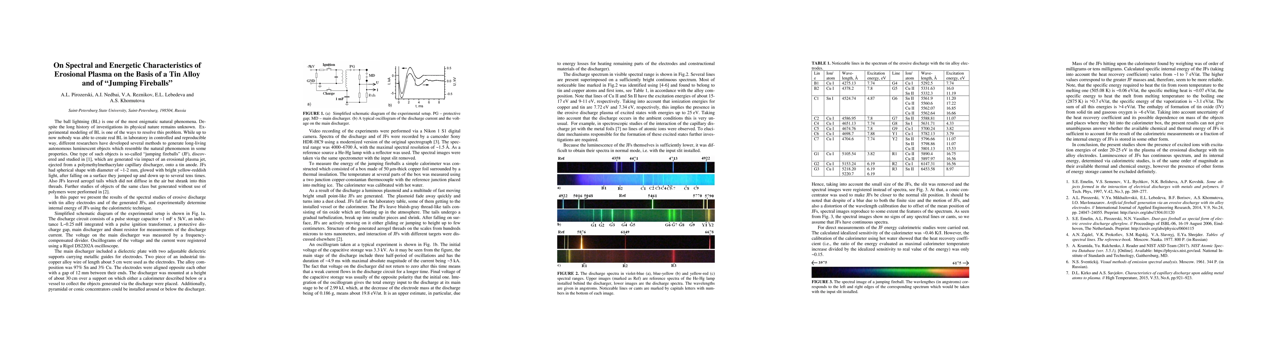This paper investigates the spectral characteristics of erosive discharges using tin alloy electrodes and analyzes "jumping fireballs" (JFs) generated by these discharges, while also determining the internal energy of JFs through calorimetric measurements.