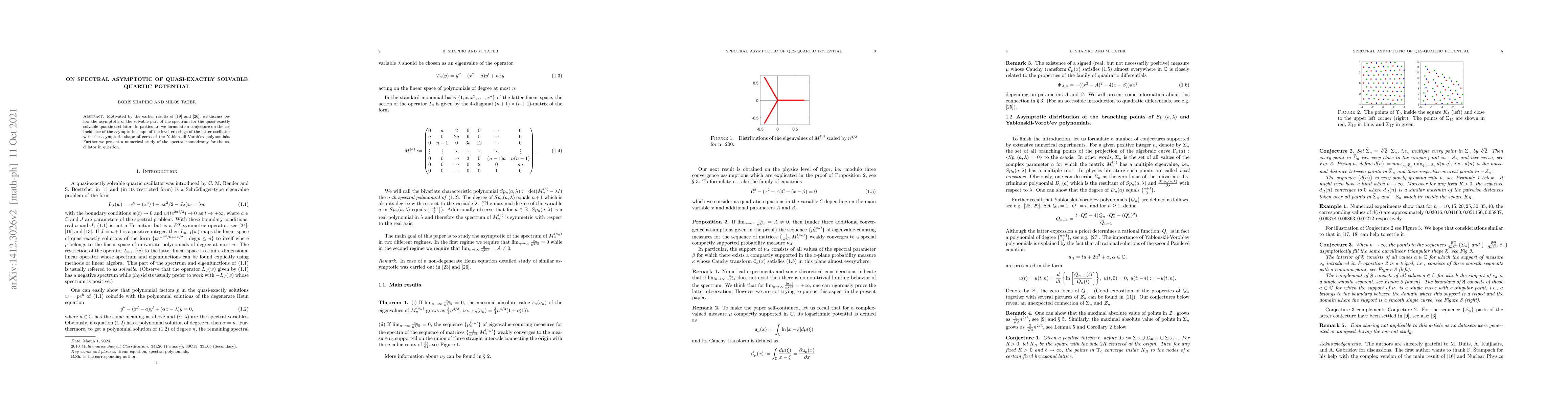 Motivated by the earlier results, we study theoretically and numerically the asymptotics and the monodromy of the quasi-exactly solvable part of the spectrum of the quasi-exactly solvable quartic introduced by C.~M.~Bender and S.~Boettcher. In particular, we formulate a conjecture on the coincidence of the asymptotic shape of the configuration of the branching points of the latter quartic with the asymptotic shape of zeros of the Yablonskii-Vorob'ev polynomials recently described and present its (conjectural) alternative description. Further we present a numerical study of the spectral monodromy for the os- cillator in question.