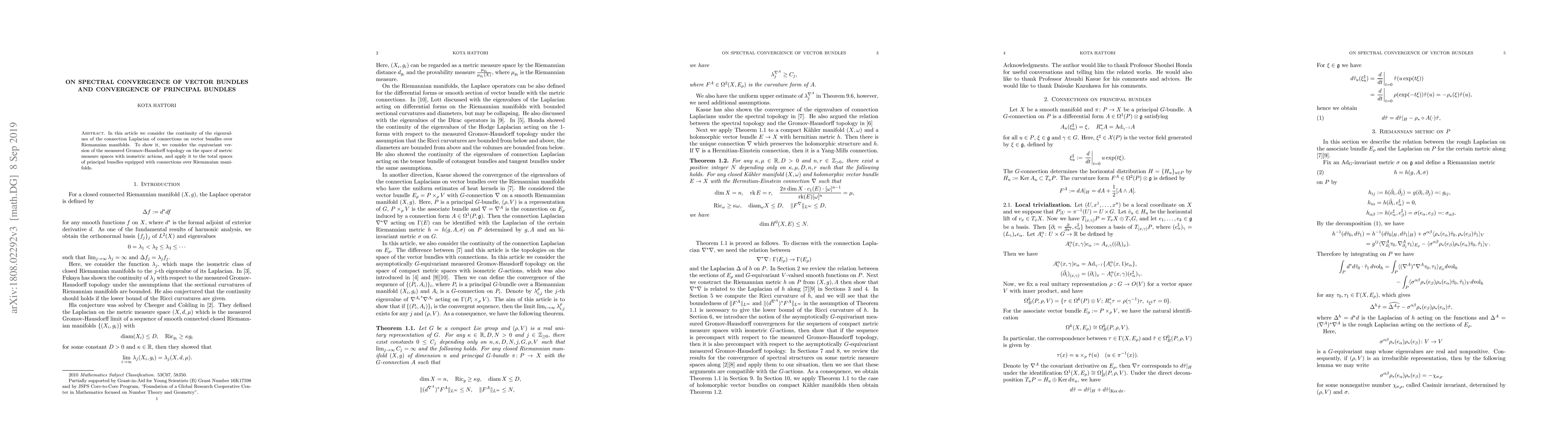 This paper investigates the spectral convergence of $G$-connections on vector bundles over Riemannian manifolds, introducing an asymptotically $G$-equivariant measured Gromov-Hausdorff topology to demonstrate the continuity of the eigenvalues of the connection Laplacian. The method is applied to principal $G$-bundles with $G$-connections.