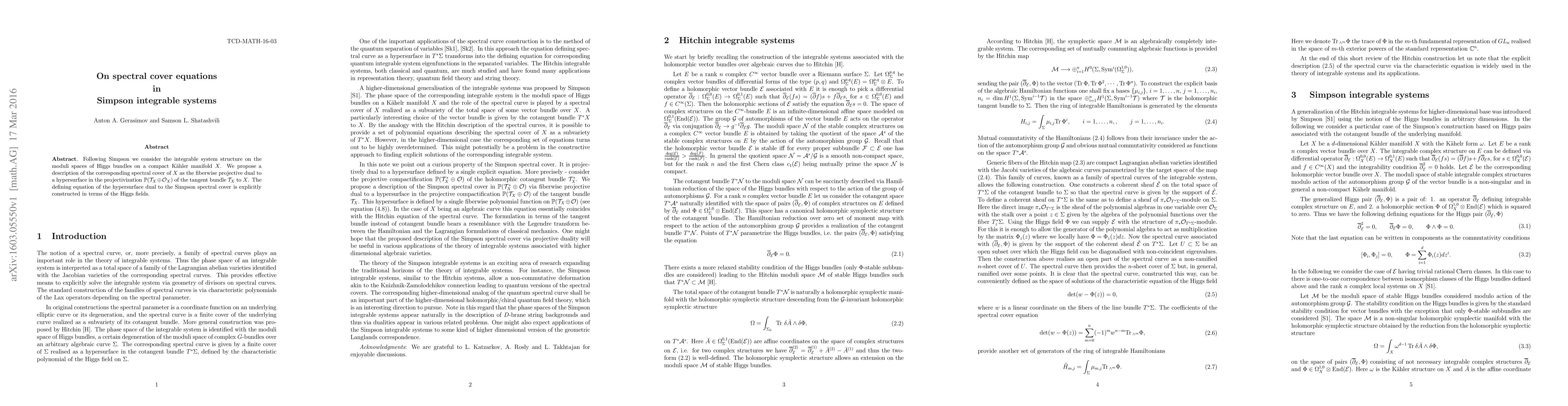 Following Simpson we consider the integrable system structure on the moduli spaces of Higgs bundles on a compact K\"ahler manifold $X$. We propose a description of the corresponding spectral cover of $X$ as the fiberwise projective dual to a hypersurface in the projectivization $\mathbb{P}(\mathcal{T}_{X} \oplus \mathcal{O}_X)$ of the tangent bundle $\mathcal{T}_X$ to $X$. The defining equation of the hypersurface dual to the Simpson spectral cover is explicitly constructed in terms of the Higgs fields.