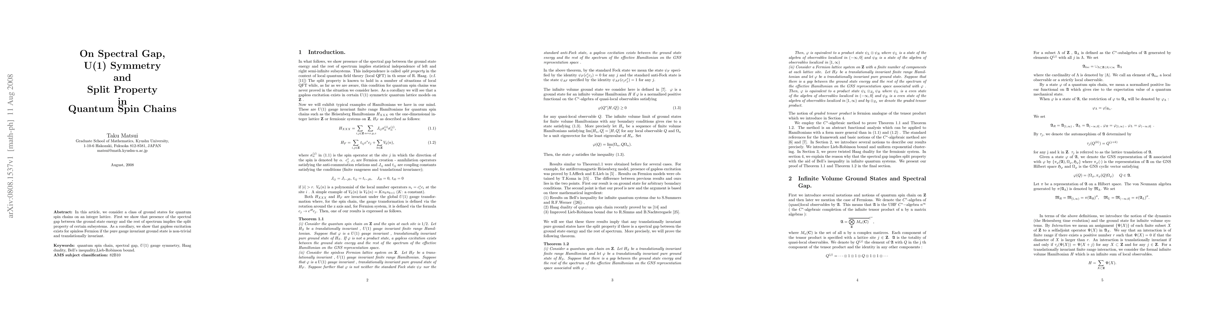 This paper explores the connection between spectral gaps in quantum spin chains and the existence of gapless excitations, particularly for spinless Fermions, and finds that a non-trivial ground state can lead to such phenomena.