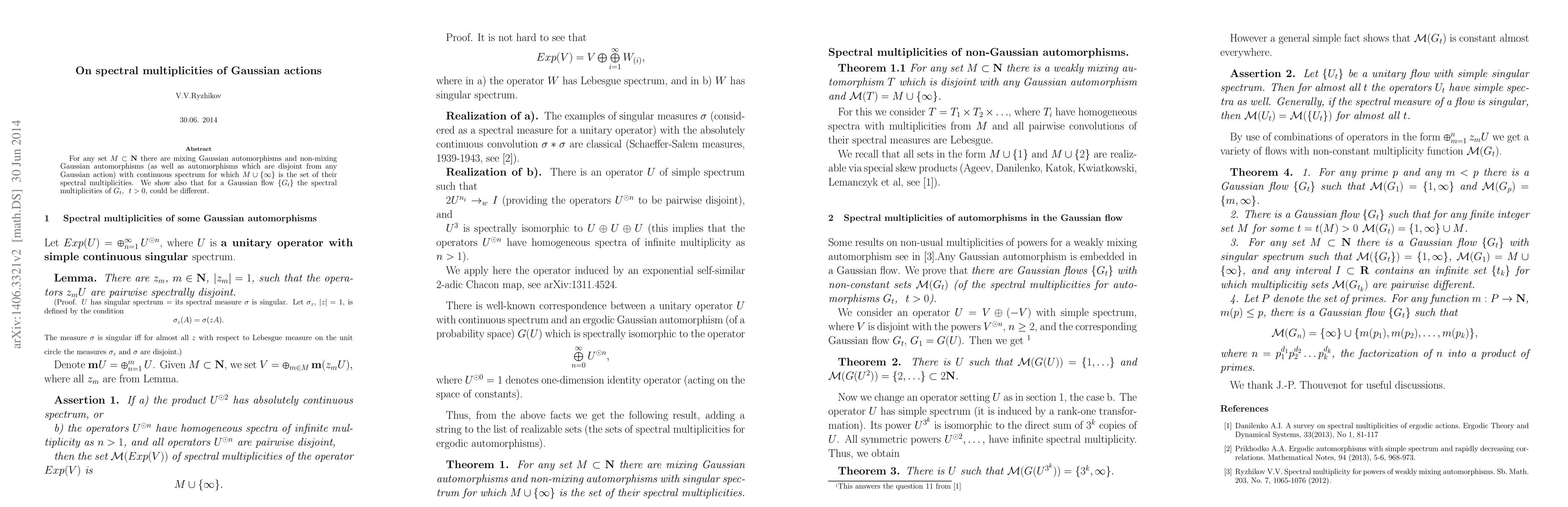 For any set $M$ of natural numbers there are mixing Gaussian automorphisms and non-mixing Gaussian automorphisms with singular spectrum (as well as some automorphisms which are disjoint from all Gaussian actions) such that $ M\cup\{\infty\}$ is the set of their spectral multiplicities. We show also that for a Gaussian flow $\{G_t\}$ the sets of spectral multiplicities for some automorphisms $G_t$, $t>0$, could be different.
