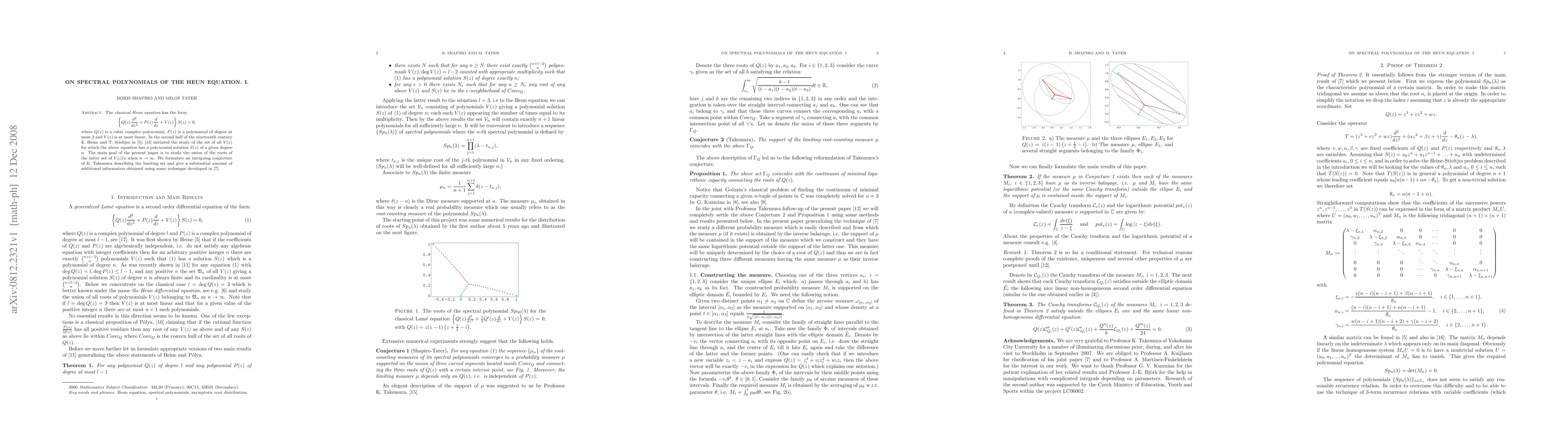 The classical Heun equation has the form {Q(z) d^2/dz^2 +P(z) d/dz +V(z)}S(z)=0 where Q(z) is a cubic, P(z) at most quadratic and V(z) linear polynomials resp. In the second half of the 19-th century E.Heine and T.STieltjes initiated the study of the set of all V(z) such that the above equation has a polynomial solution S(z) of a given degree n. The main goal of the present paper is to study the union of the roots of the latter set of V(z)*s when n->oo. We formulate an intriguing conjecture of K.Takemura describing the limiting set and give a substantial amount of additional information.