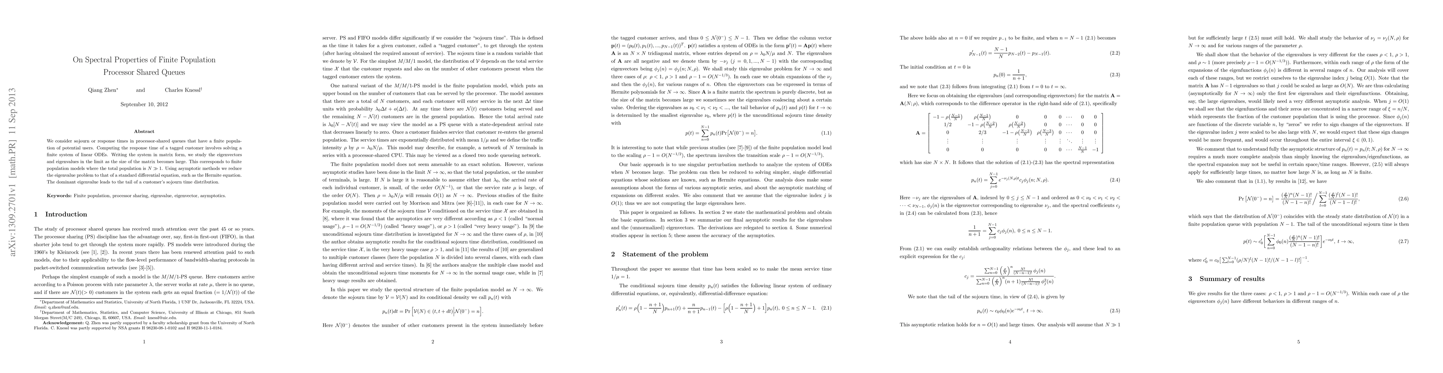 We consider sojourn or response times in processor-shared queues that have a finite population of potential users. Computing the response time of a tagged customer involves solving a finite system of linear ODEs. Writing the system in matrix form, we study the eigenvectors and eigenvalues in the limit as the size of the matrix becomes large. This corresponds to finite population models where the total population is $N\gg 1$. Using asymptotic methods we reduce the eigenvalue problem to that of a standard differential equation, such as the Hermite equation. The dominant eigenvalue leads to the tail of a customer's sojourn time distribution.