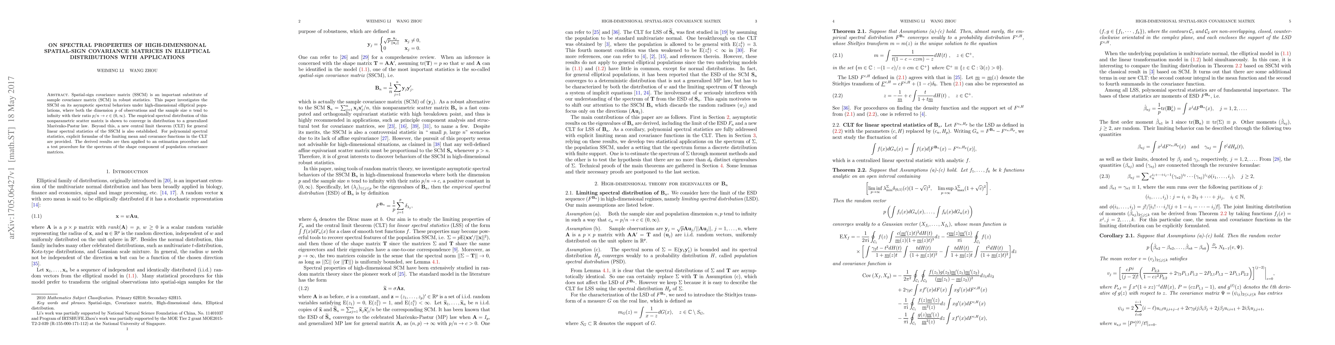 This paper examines the asymptotic spectral properties of high-dimensional spatial-sign covariance matrices under elliptical distributions, showing convergence to a generalized Marčenko-Pastur law and establishing a new central limit theorem for linear spectral statistics. The findings are applied to estimation and testing procedures for the shape component of population covariance matrices.