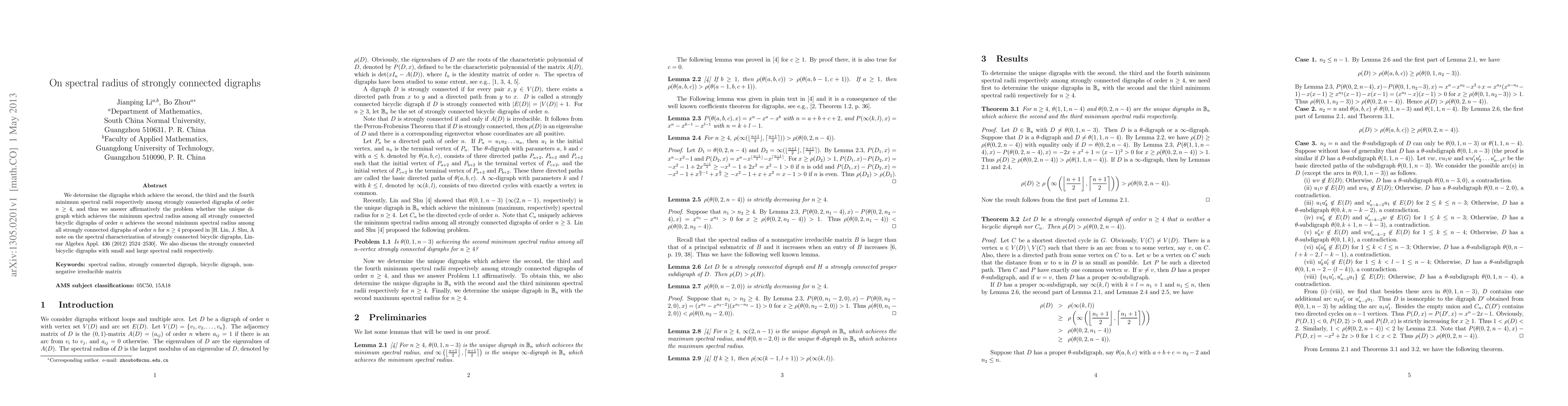 We determine the digraphs which achieve the second, the third and the fourth minimum spectral radii respectively among strongly connected digraphs of order $n\ge 4$, and thus we answer affirmatively the problem whether the unique digraph which achieves the minimum spectral radius among all strongly connected bicyclic digraphs of order $n$ achieves the second minimum spectral radius among all strongly connected digraphs of order $n$ for $n\ge 4$ proposed in [H. Lin, J. Shu, A note on the spectral characterization of strongly connected bicyclic digraphs, Linear Algebra Appl. 436 (2012) 2524--2530]. We also discuss the strongly connected bicyclic digraphs with small and large spectral radii respectively.