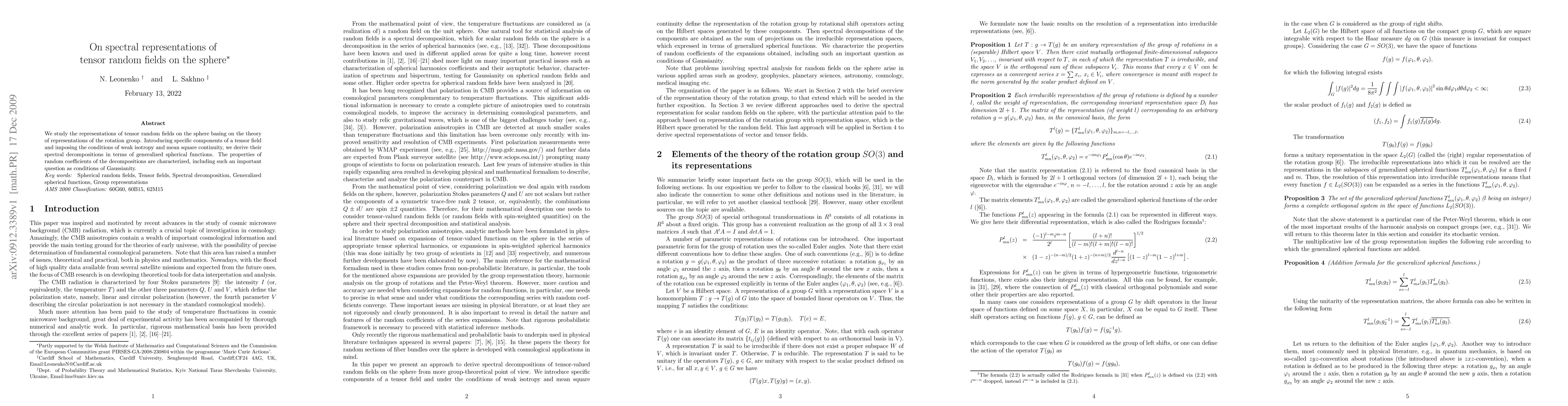 This paper investigates the spectral representations of tensor random fields on the sphere, deriving their decompositions based on the rotation group's representation theory and characterizing the properties of random coefficients, including conditions for Gaussianity.
