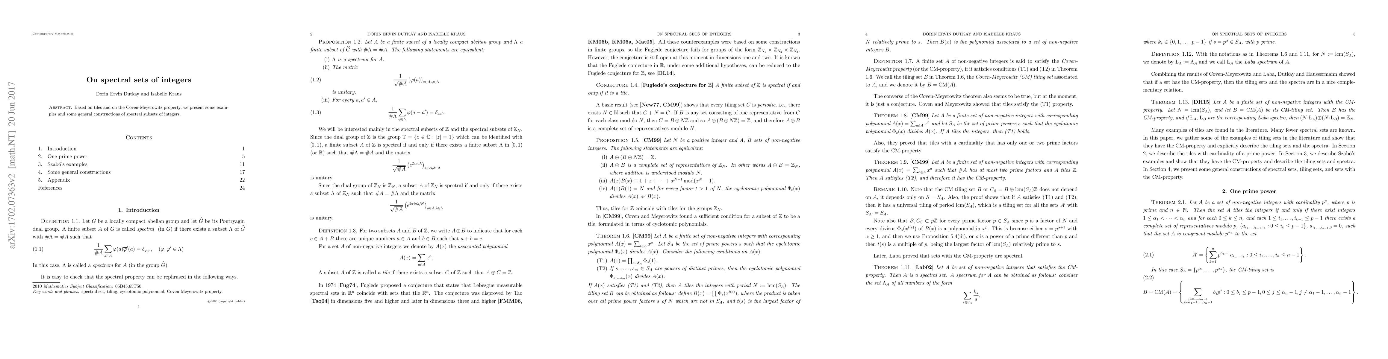 This paper explores spectral subsets of integers through tile-based constructions and the Coven-Meyerowitz property, providing examples and general methods for identifying such subsets.