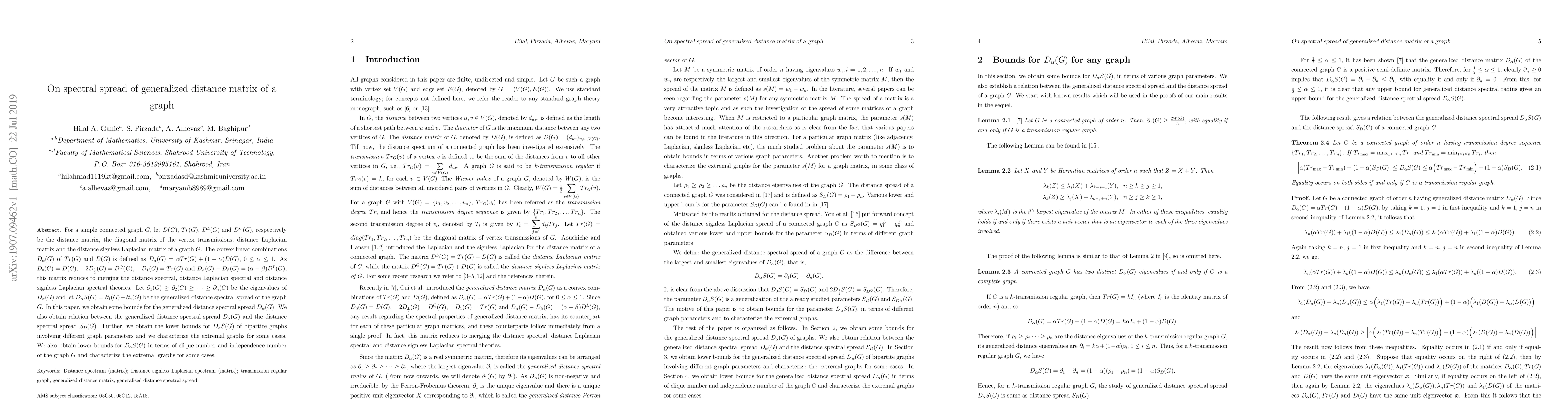 For a simple connected graph $G$, let $D(G)$, $Tr(G)$, $D^{L}(G)$ and $D^{Q}(G)$, respectively be the distance matrix, the diagonal matrix of the vertex transmissions, distance Laplacian matrix and the distance signless Laplacian matrix of a graph $G$. The convex linear combinations $D_{\alpha}(G)$ of $Tr(G)$ and $D(G)$ is defined as $D_{\alpha}(G)=\alpha Tr(G)+(1-\alpha)D(G)$, $0\leq \alpha\leq 1$. As $D_{0}(G)=D(G), ~~~ 2D_{\frac{1}{2}}(G)=D^{Q}(G), ~~~ D_{1}(G)=Tr(G)$ and $D_{\alpha}(G)-D_{\beta}(G)=(\alpha-\beta)D^{L}(G)$, this matrix reduces to merging the distance spectral, distance Laplacian spectral and distance signless Laplacian spectral theories. Let $\partial_{1}(G)\geq \partial_{2}(G)\geq \dots \geq \partial_{n}(G)$ be the eigenvalues of $D_{\alpha}(G)$ and let $D_{\alpha}S(G)=\partial_{1}(G)-\partial_{n}(G)$ be the generalized distance spectral spread of the graph $G$. In this paper, we obtain some bounds for the generalized distance spectral spread $D_{\alpha}(G)$. We also obtain relation between the generalized distance spectral spread $D_{\alpha}(G)$ and the distance spectral spread $S_{D}(G)$. Further, we obtain the lower bounds for $D_{\alpha}S(G)$ of bipartite graphs involving different graph parameters and we characterize the extremal graphs for some cases. We also obtain lower bounds for $D_{\alpha}S(G)$ in terms of clique number and independence number of the graph $G$ and characterize the extremal graphs for some cases.