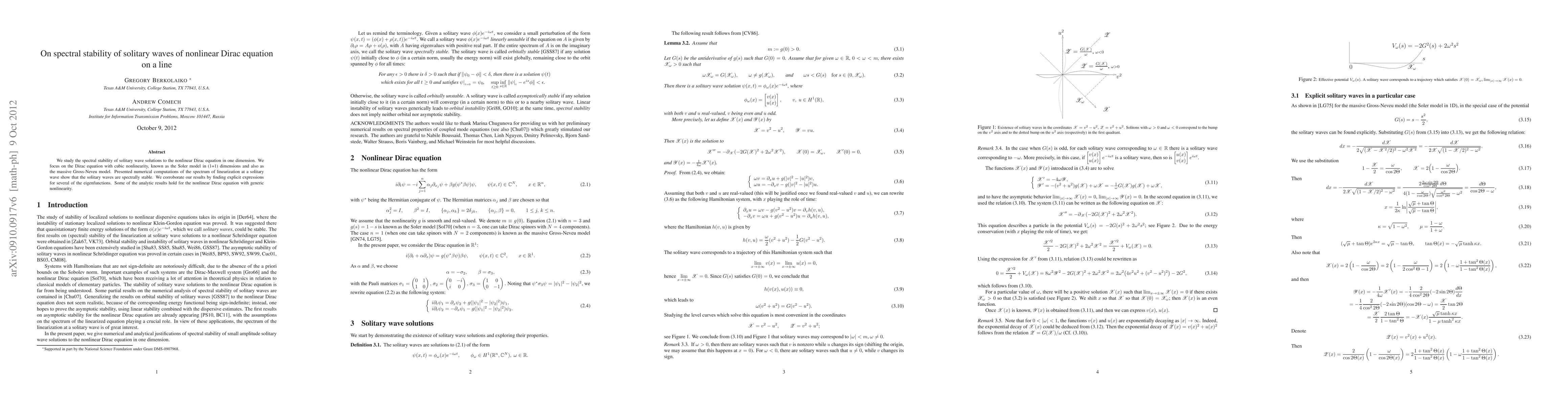 This paper investigates the spectral stability of solitary wave solutions to the nonlinear Dirac equation with cubic nonlinearity in one dimension. Numerical computations reveal that these solitary waves are spectrally stable, supported by explicit eigenfunction expressions, with some results extending to more general nonlinearities.