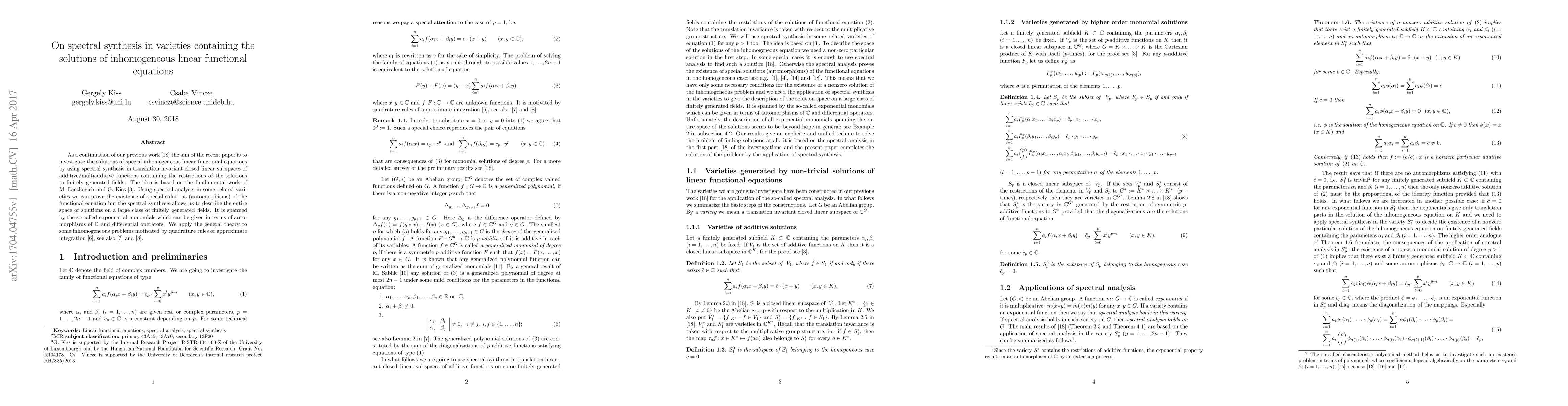 As a continuation of our previous work \cite{KV2} the aim of the recent paper is to investigate the solutions of special inhomogeneous linear functional equations by using spectral synthesis in translation invariant closed linear subspaces of additive/multiadditive functions containing the restrictions of the solutions to finitely generated fields. The idea is based on the fundamental work of M. Laczkovich and G. Kiss \cite{KL}. Using spectral analysis in some related varieties we can prove the existence of special solutions (automorphisms) of the functional equation but the spectral synthesis allows us to describe the entire space of solutions on a large class of finitely generated fields. It is spanned by the so-called exponential monomials which can be given in terms of automorphisms of $\cc$ and differential operators. We apply the general theory to some inhomogeneous problems motivated by quadrature rules of approximate integration \cite{KKSZ08}, see also \cite{KKSZ} and \cite{KKSZW}.