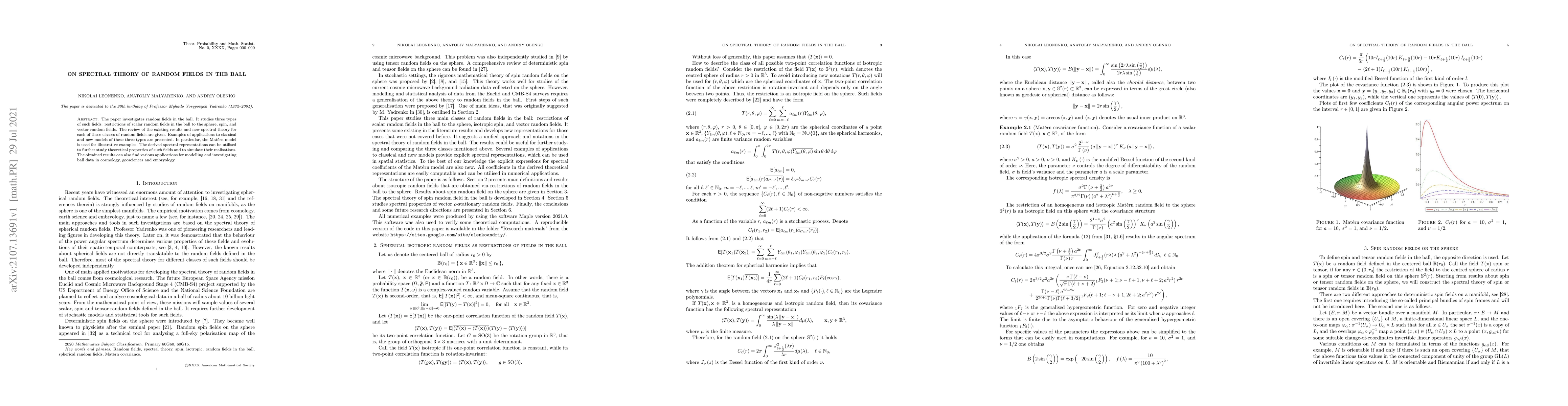 This paper develops a spectral theory for three types of random fields within a ball: scalar, spin, and vector fields. It reviews existing results and introduces new spectral representations, with applications to models like the Matérn model, and potential uses in cosmology, geosciences, and embryology.