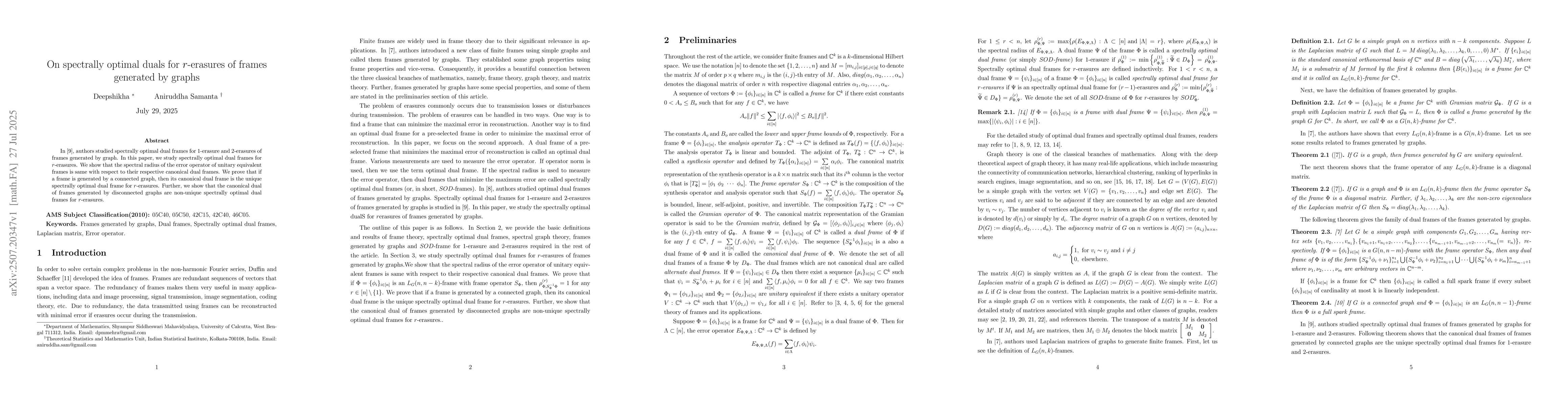 In [9], authors studied spectrally optimal dual frames for 1-erasure and 2-erasures of frames generated by graph. In this paper, we study spectrally optimal dual frames for r-erasures. We show that the spectral radius of the error operator of unitary equivalent frames is same with respect to their respective canonical dual frames. We prove that if a frame is generated by a connected graph, then its canonical dual frame is the unique spectrally optimal dual frame for r-erasures. Further, we show that the canonical dual of frames generated by disconnected graphs are non-unique spectrally optimal dual frames for r-erasures.