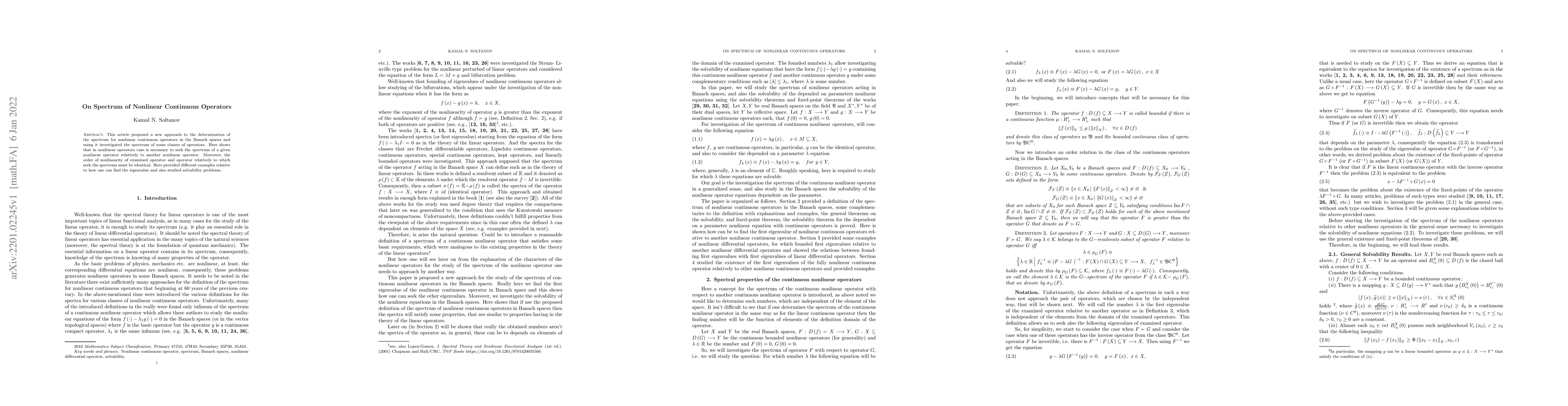 This paper introduces a novel method for determining the spectrum of nonlinear continuous operators in Banach spaces, emphasizing the necessity of comparing the spectrum relative to another nonlinear operator of identical order. It also explores eigenvalue determination and solvability issues through various examples.