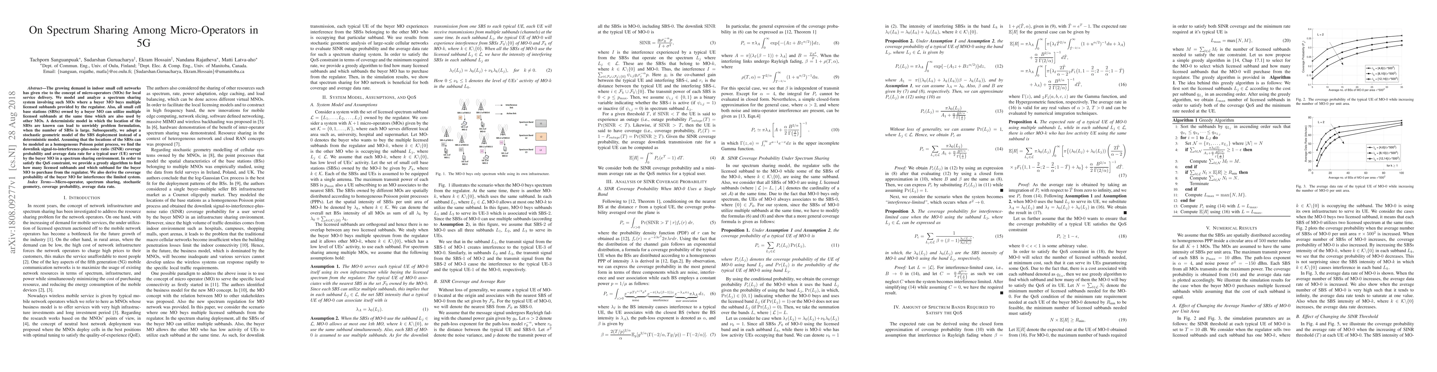 The growing demand in indoor small cell networks has given rise to the concept of micro-operators (MOs) for local service delivery. We model and analyze a spectrum sharing system involving such MOs where a buyer MO buys multiple licensed subbands provided by the regulator. Also, all small cell base stations (SBSs) owned by a buyer MO can utilize multiple licensed subbands at the same time which are also used by other MOs. A deterministic model in which the location of the SBSs are known can lead to unwieldy problem formulation, when the number of SBSs is large. Subsequently, we adopt a stochastic geometric model of the SBS deployment instead of a deterministic model. Assuming that the locations of the SBSs can be modeled as a homogeneous Poisson point process, we find the downlink signal-to-interference-plus-noise ratio (SINR) coverage probability and average data rate for a typical user (UE) served by the buyer MO in a spectrum sharing environment. In order to satisfy the QoS constraint, we provide a greedy algorithm to find how many licensed subbands and which subband for the buyer MO to purchase from the regulator. We also derive the coverage probability of the buyer MO for interference the limited system.
