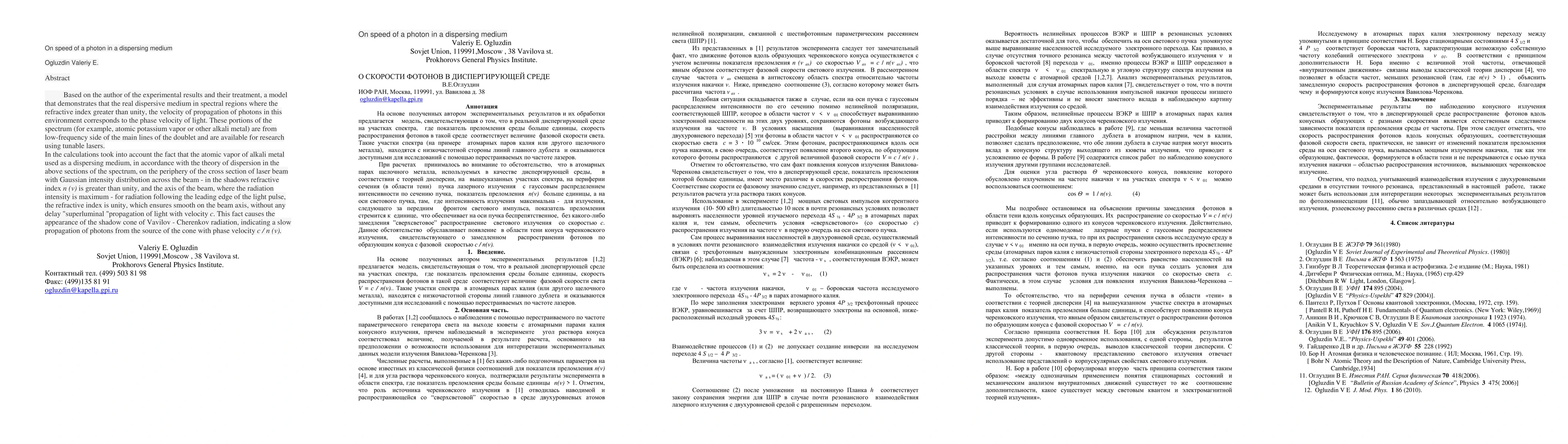 On speed of a photon in a dispersing medium Ogluzdin Valeriy E. Abstract Based on the author of the experimental results and their treatment, a model that demonstrates that the real dispersive medium in spectral regions where the refractive index greater than unity, the velocity of propagation of photons in this environment corresponds to the phase velocity of light. These portions of the spectrum (for example, atomic potassium vapor or other alkali metal) are from low-frequency side of the main lines of the doublet and are available for research using tunable lasers. In the calculations took into account the fact that the atomic vapor of alkali metal used as a dispersing medium, in accordance with the theory of dispersion in the above sections of the spectrum, on the periphery of the cross section of laser beam with Gaussian intensity distribution across the beam - in the shadows refractive index n ({\nu}) is greater than unity, and the axis of the beam, where the radiation intensity is maximum - for radiation following the leading edge of the light pulse, the refractive index is unity, which ensures smooth on the beam axis, without any delay "superluminal "propagation of light with velocity c. This fact causes the appearance of the shadow cone of Vavilov - Cherenkov radiation, indicating a slow propagation of photons from the source of the cone with phase velocity c / n ({\nu}).