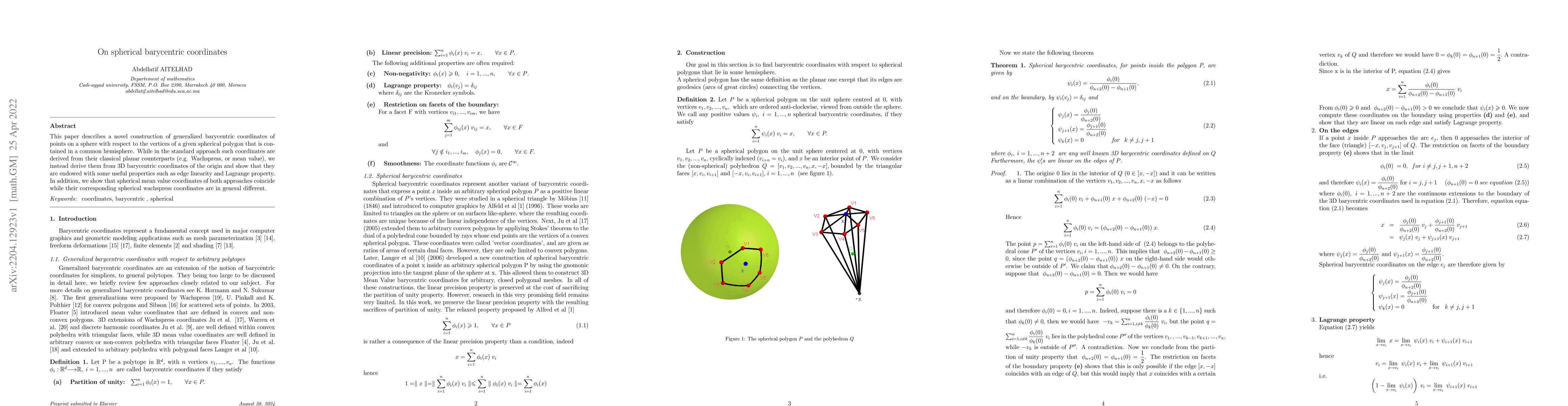 This paper introduces a new method for deriving barycentric coordinates on a sphere from 3D barycentric coordinates, demonstrating properties like edge linearity and Lagrange property, and showing that while spherical mean value coordinates match, spherical Wachspress coordinates differ from the standard planar-derived approach.